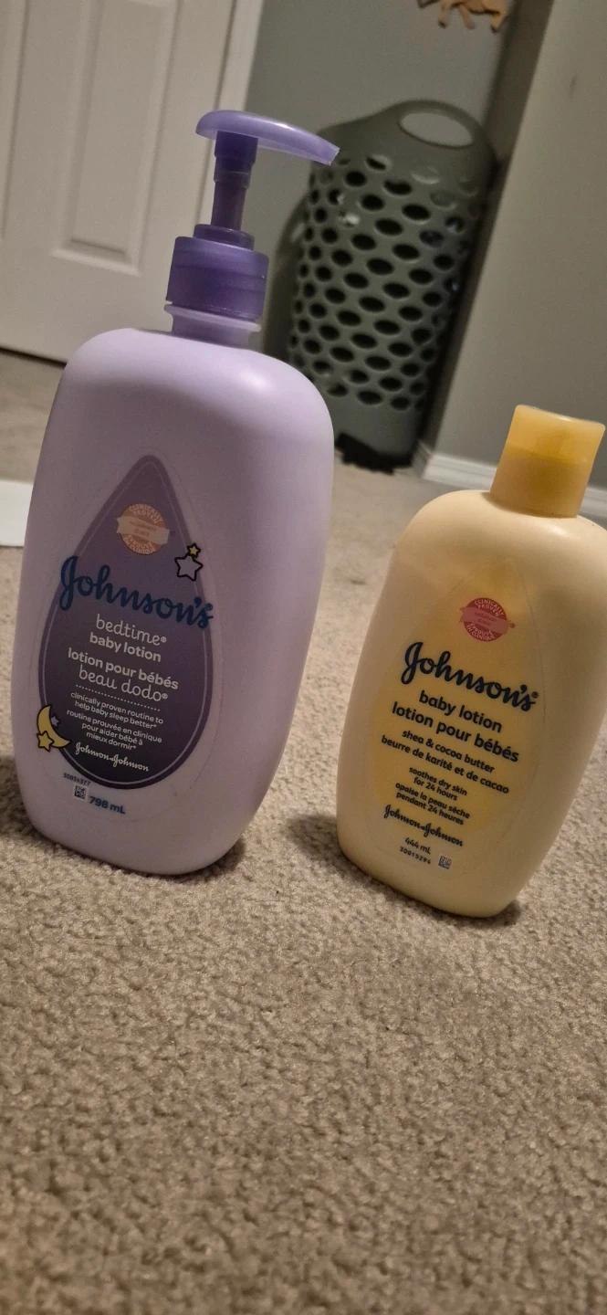 Selling a set of Johnson's baby lotions. One is the Bedtime Baby Lotion (798 mL) and the other is the Shea & Cocoa Butter Baby Lotion (444 mL). Perfect for keeping your little one's skin soft and moisturized!