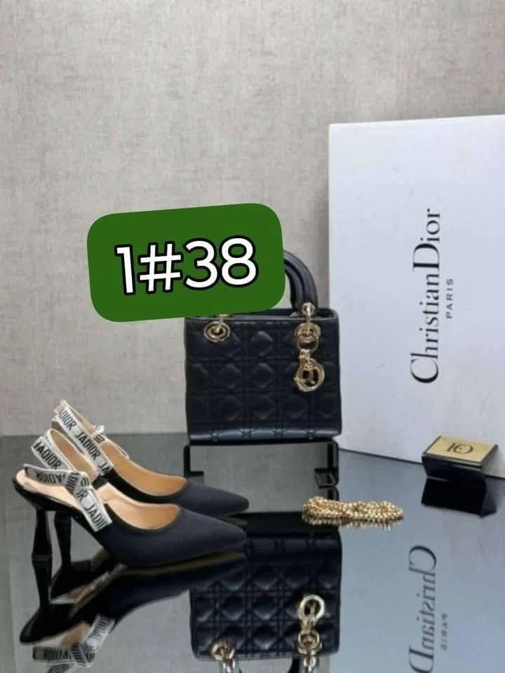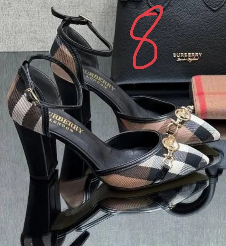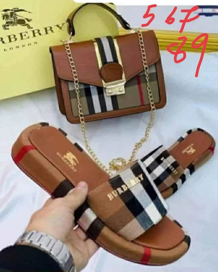 A collection of designer-inspired handbags and shoes. Includes Burberry handbags and slides, Chanel handbags, and Gucci heels. Perfect for adding a touch of style to your wardrobe