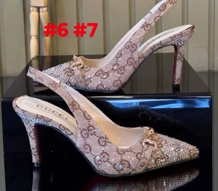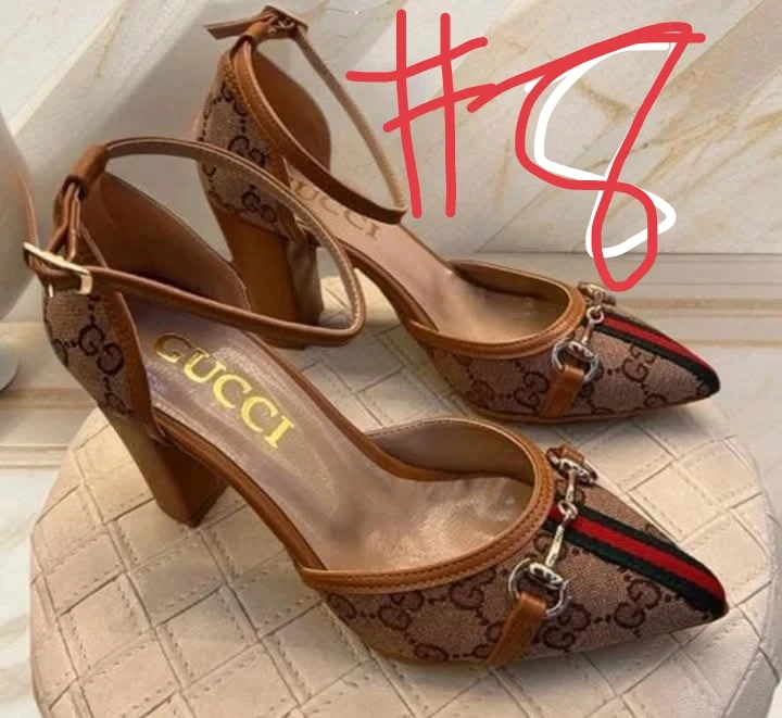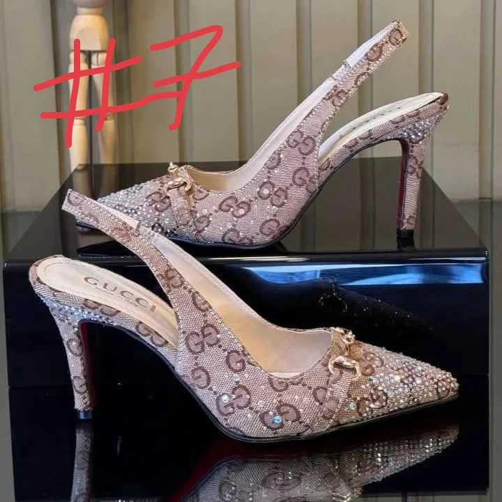 A collection of designer-inspired handbags and shoes. Includes Burberry handbags and slides, Chanel handbags, and Gucci heels. Perfect for adding a touch of style to your wardrobe