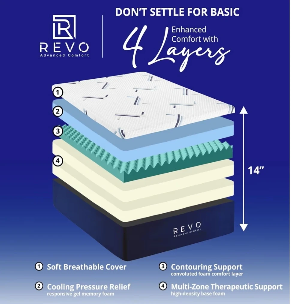 Selling a Revo Sleep 14" Gel Memory Foam Mattress. This mattress features: