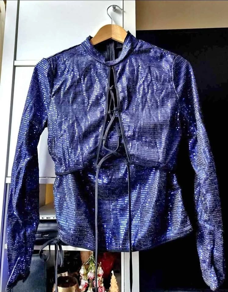 Offering a beautiful, 2-piece sequin glitter crop top and skirt set.