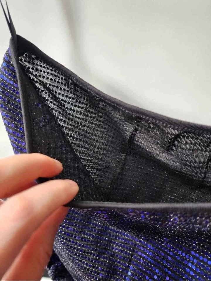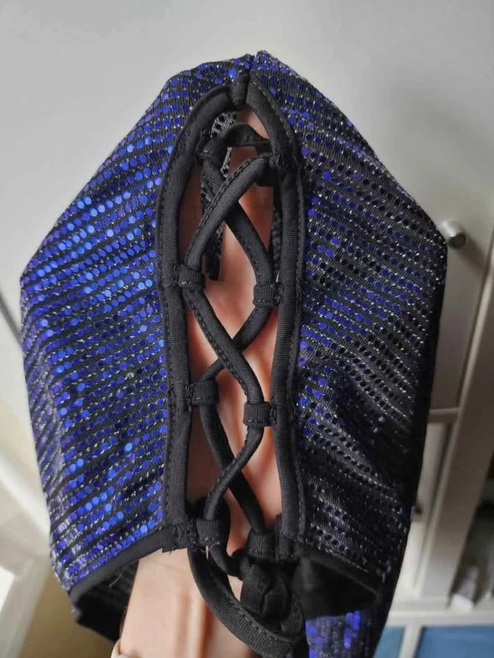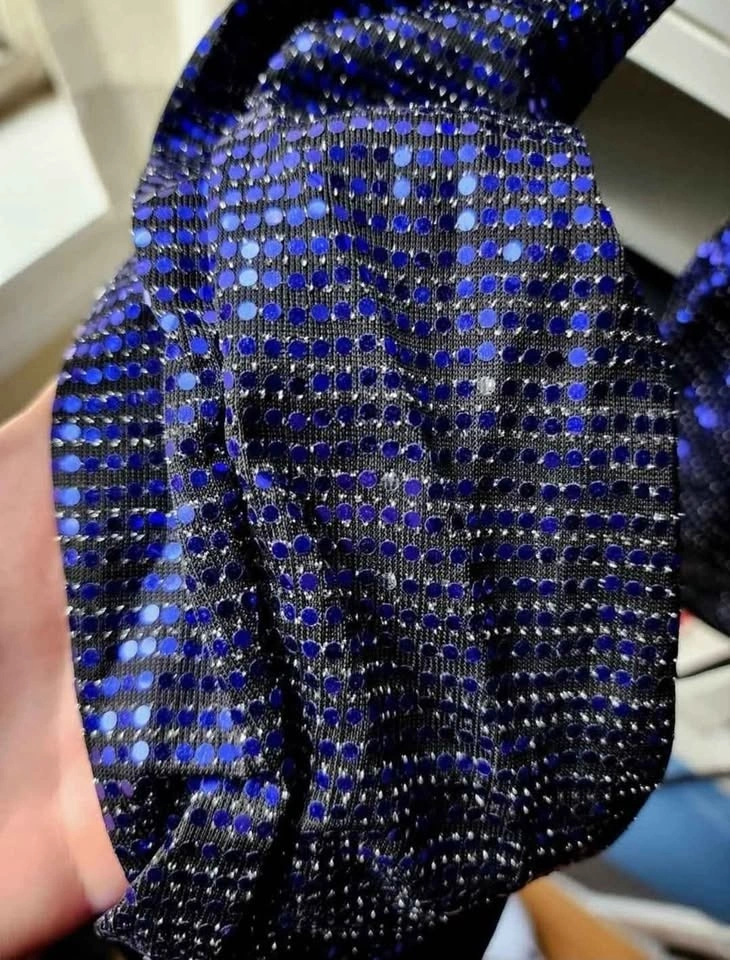 Colour: Midnight blue sequins and glitter particles on black fabric.