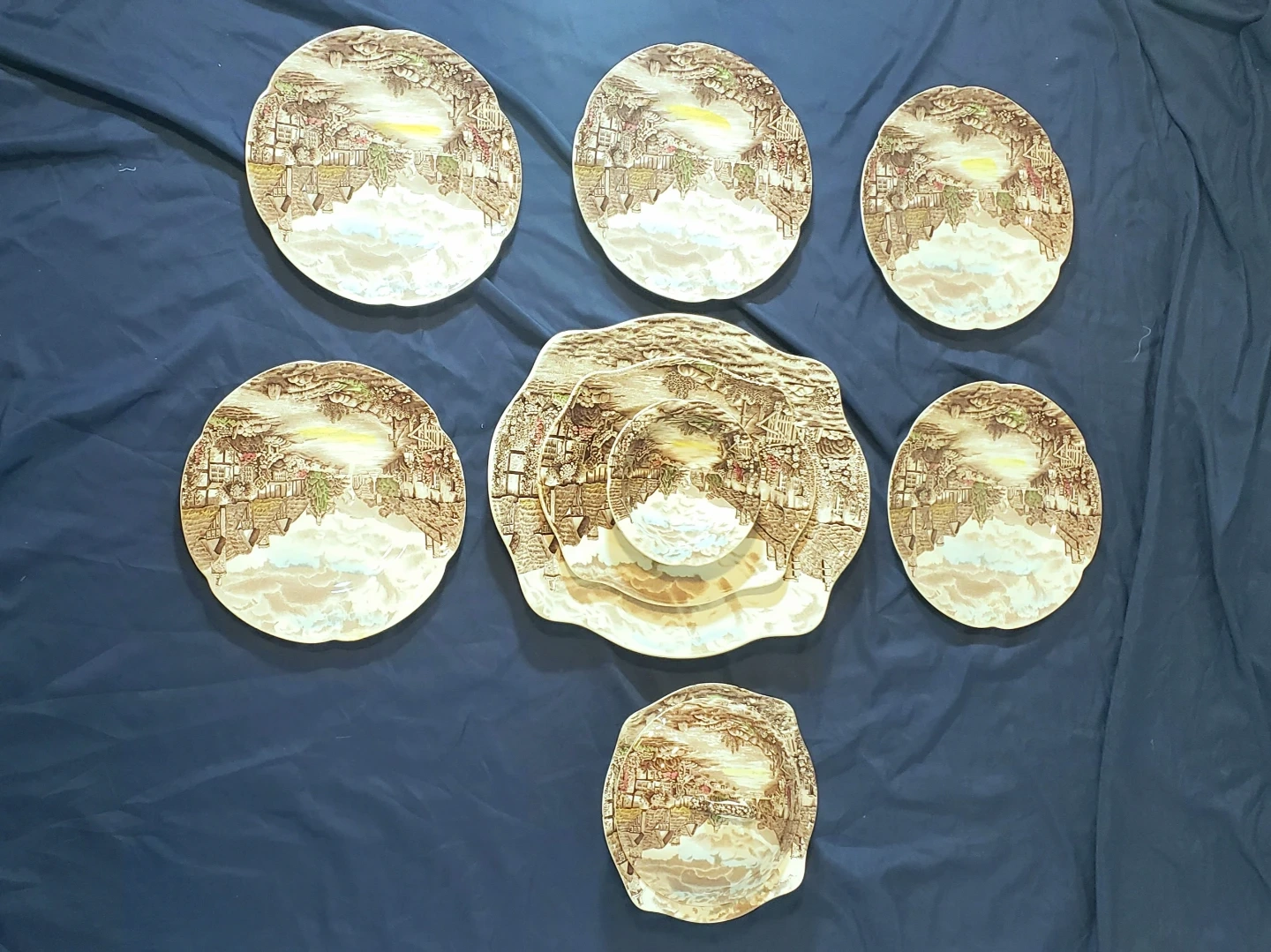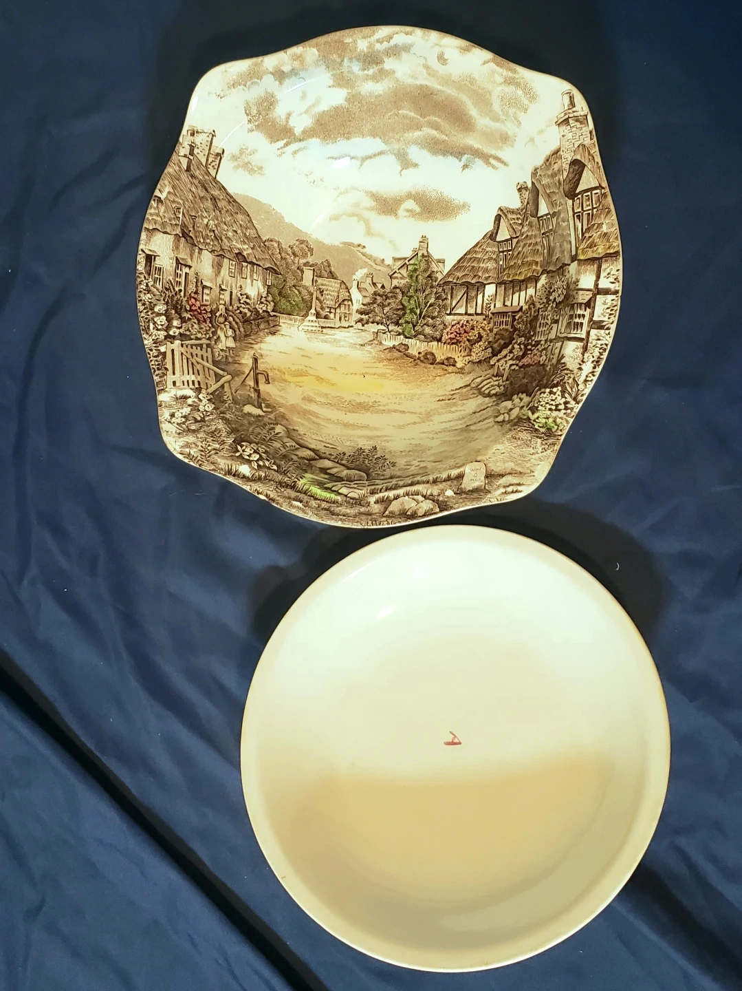All pieces have the same scene painted on them, a road leading through a sepia-toned English hamlet. The bottoms are all white.