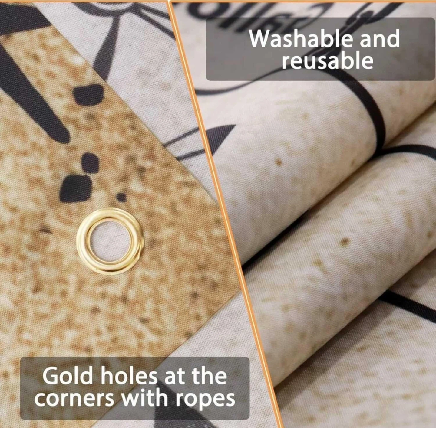 Made with fabric, itβs lightweight, reusable, washable and has reinforced grommets/string to hang. Or could use as a tablecloth or ?