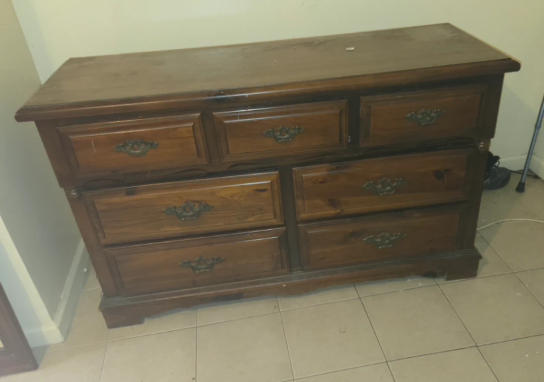 Selling a wooden dresser with 7 drawers. It's a great piece for adding storage to any bedroom or living space. The dresser has a classic design with a warm wood tone. Perfect for organizing your clothes and other belongings!