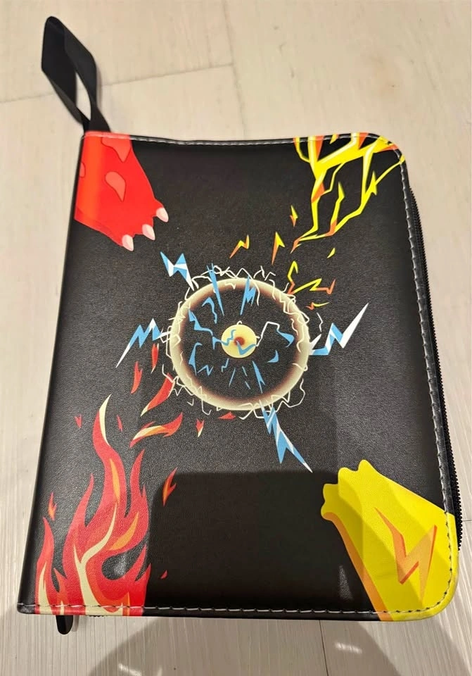 The cards included are holos/reverse holos, rares, commons and uncommons, trainers and energies from all different types of Pokémon. The binder has a handle and zipper for easy carrying.