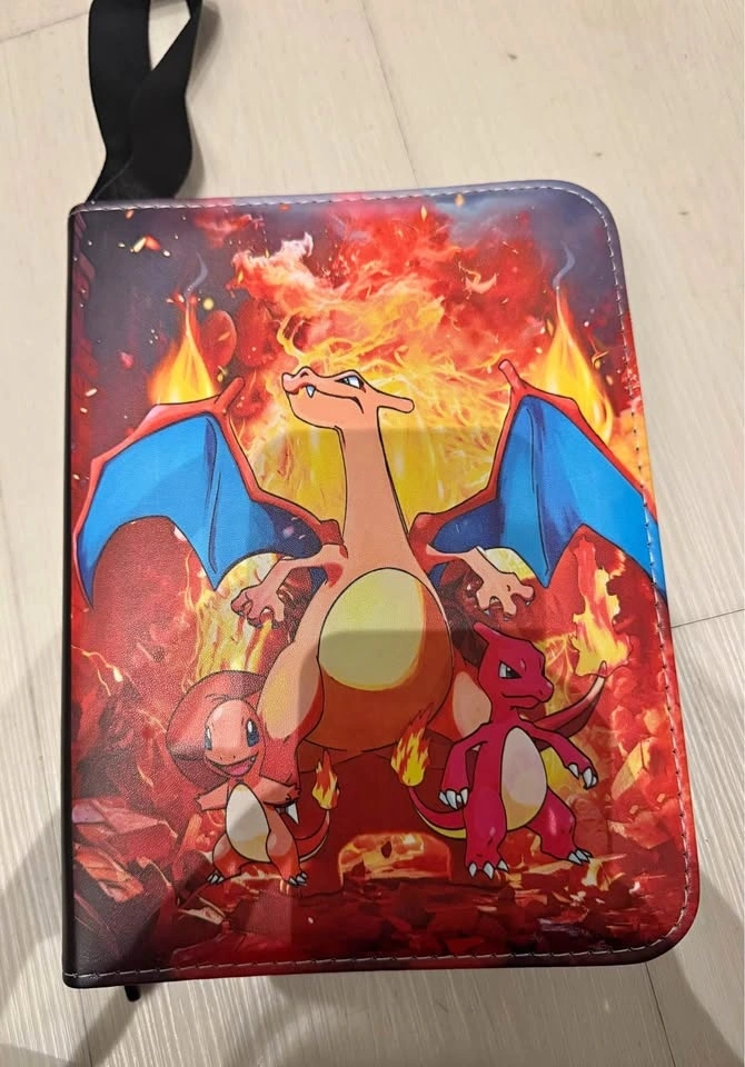 Pokemon binder, filled with 200 cards. The cards included are holos/reverse holos, rares, commons and uncommons, trainers and energies from all different types of Pokémon. The binder has a handle and zipper for easy carrying.
