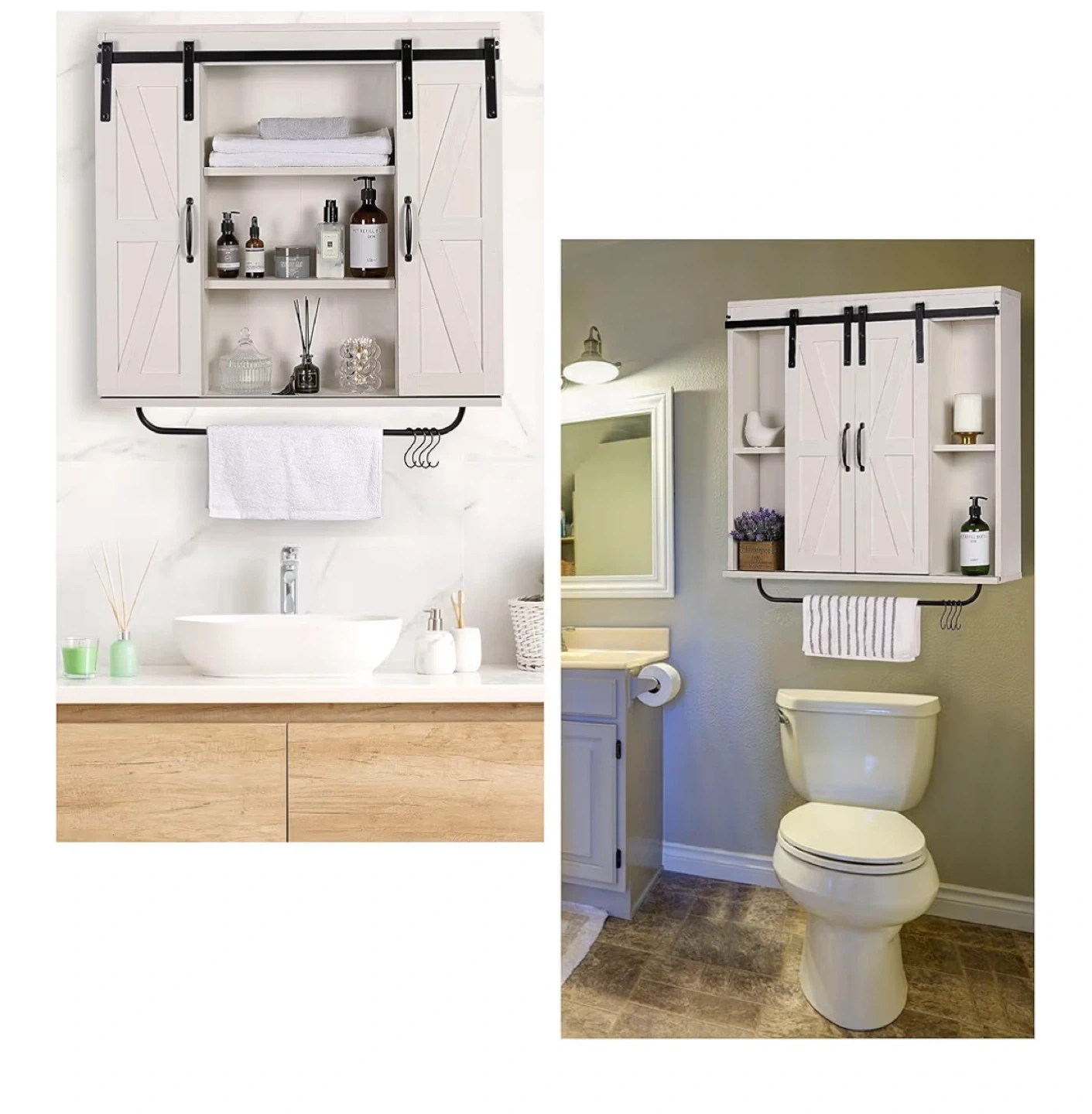 Spruce up your space with this charming RUSTOWN rustic wood wall storage cabinet! It features a vintage white finish and a sliding barn door design, perfect for adding a touch of farmhouse style to your kitchen, dining room, bathroom, or living room. It also has a removable towel bar and 5 removable hooks.