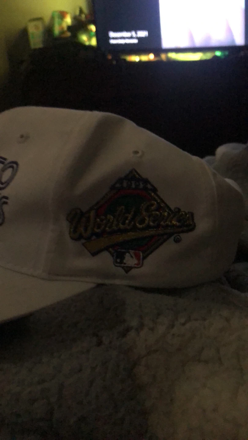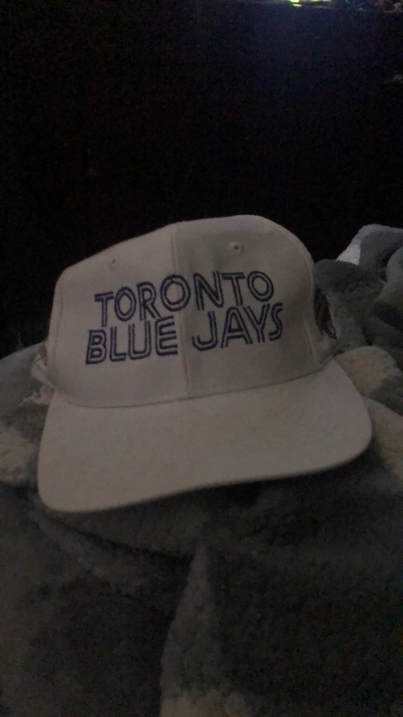 Selling a Toronto Blue Jays hat. It's white and has the World Series logo on the side. The hat also commemorates the 1992 American League Championship