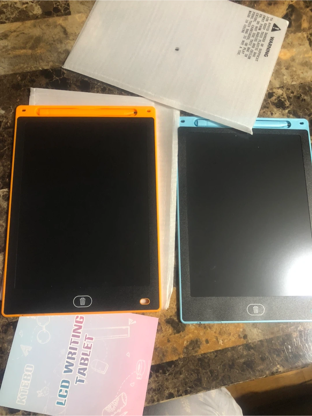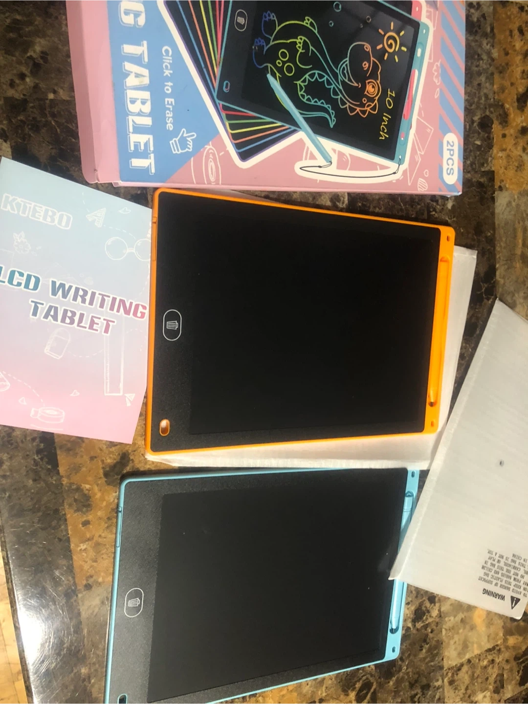 Selling a new set of two KTEBO LCD writing tablets, each 10 inches in size! One is orange and the other is blue. They're great for sparking creativity and imagination for kids, and are super lightweight and portable! Comes with the original box and instructions! I have new 25 tablets available. These tablets are a great gift for the daycare kids!