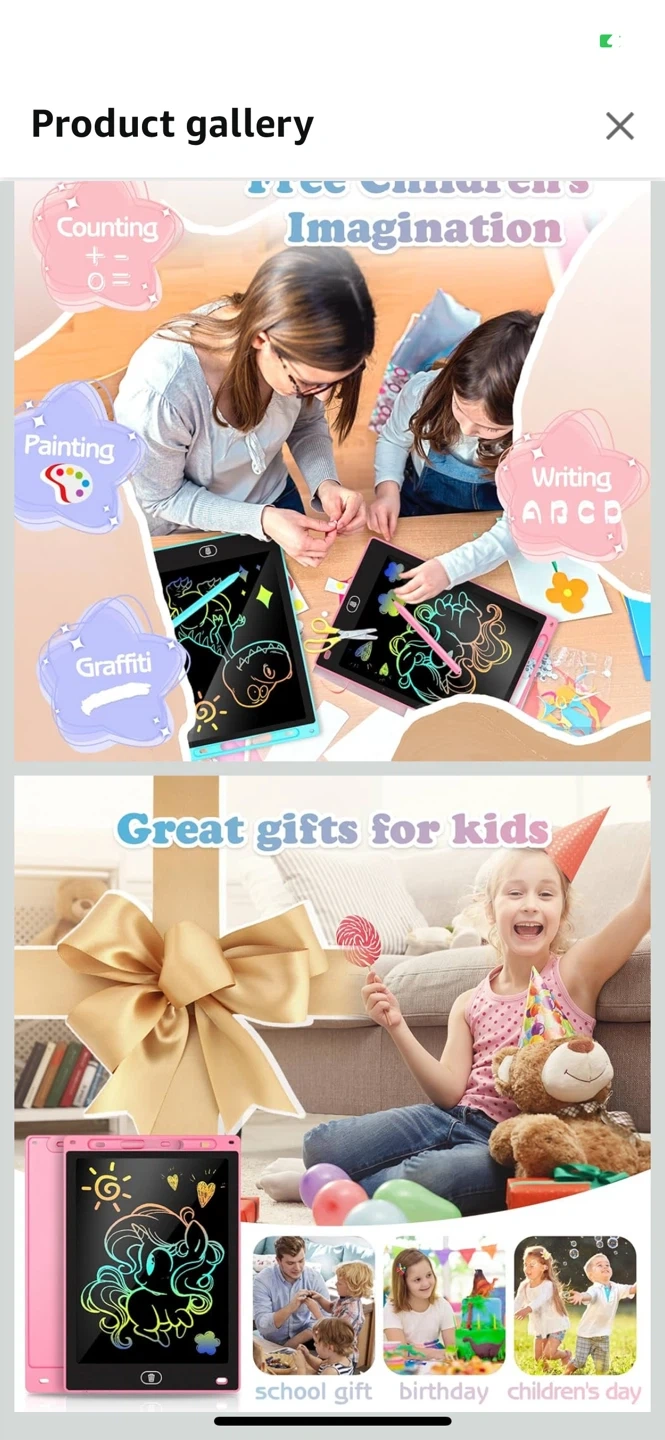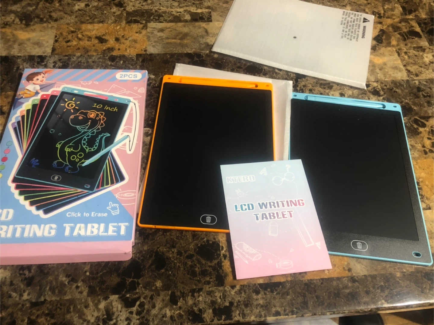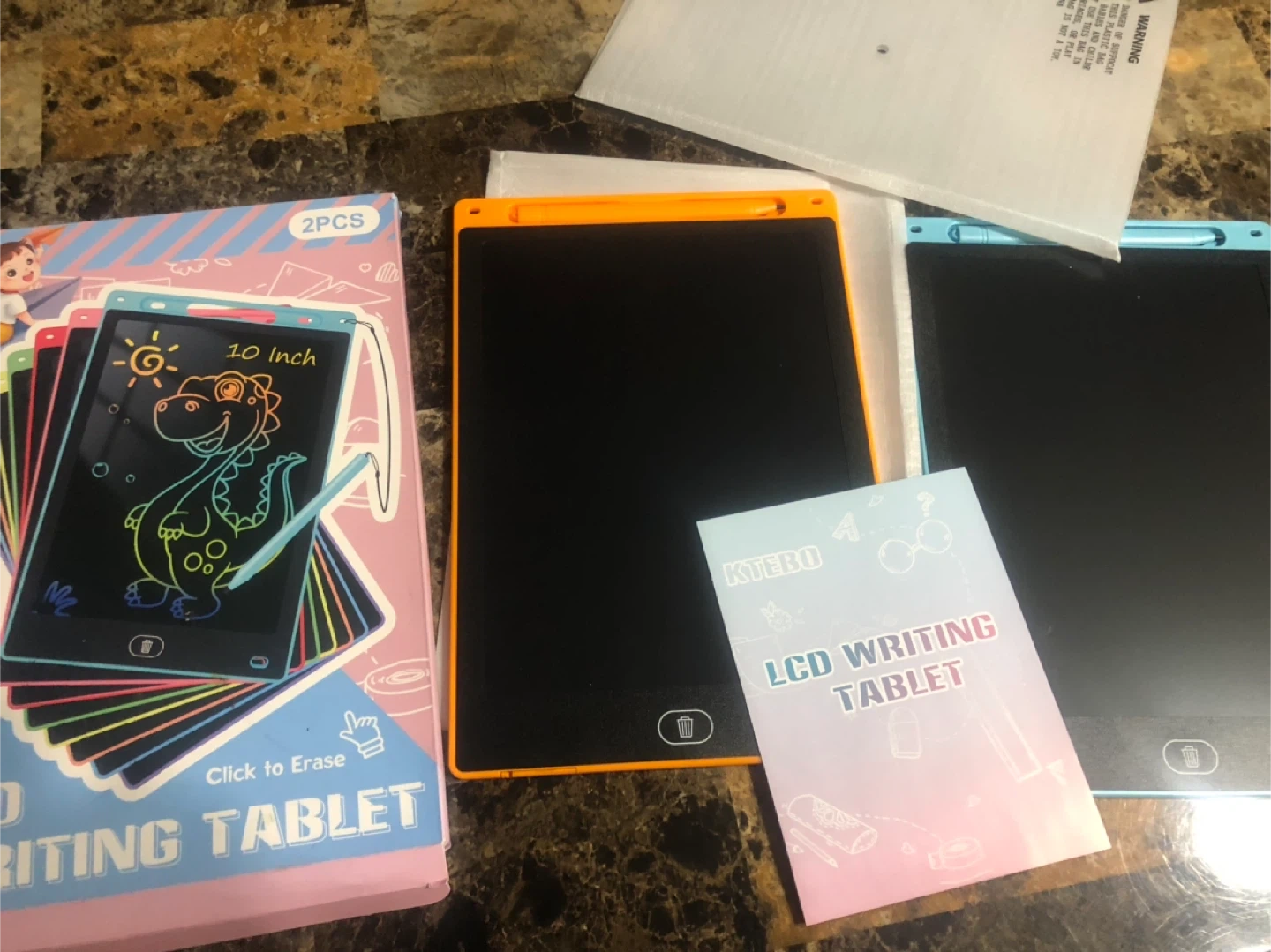 Selling a new set of two KTEBO LCD writing tablets, each 10 inches in size! One is orange and the other is blue. They're great for sparking creativity and imagination for kids, and are super lightweight and portable! Comes with the original box and instructions! I have new 25 tablets available. These tablets are a great gift for the daycare kids!