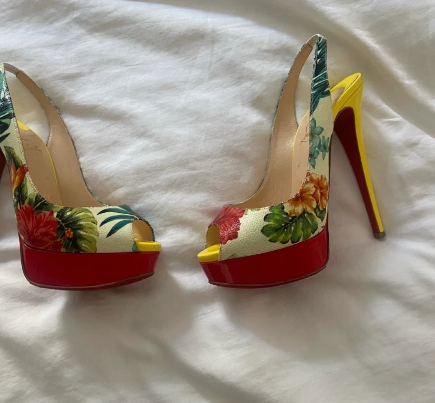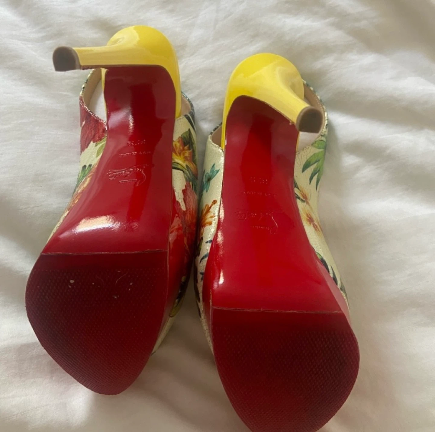 These Christian Louboutin heels feature a vibrant floral pattern with a yellow heel and red sole. They're in great condition and would add a pop of colour to any outfit