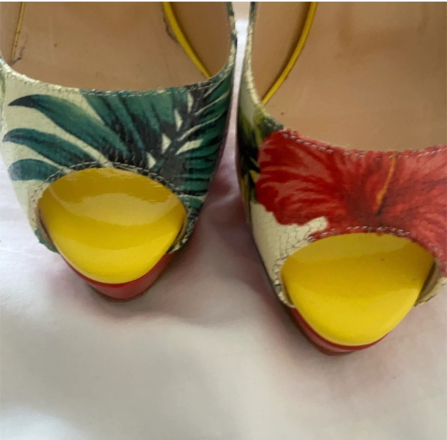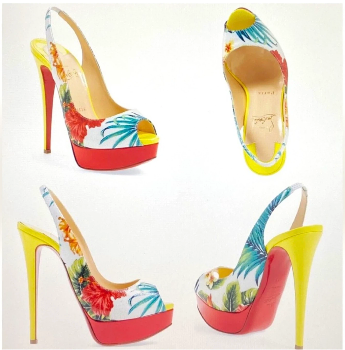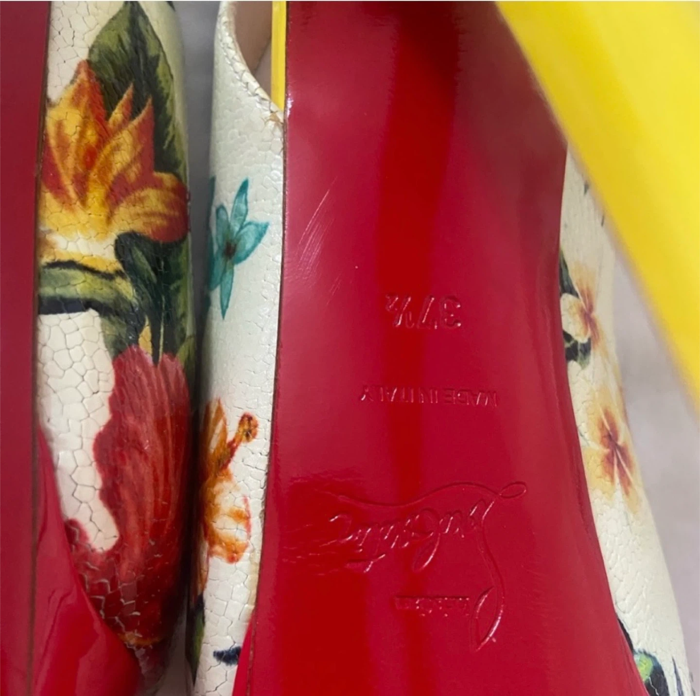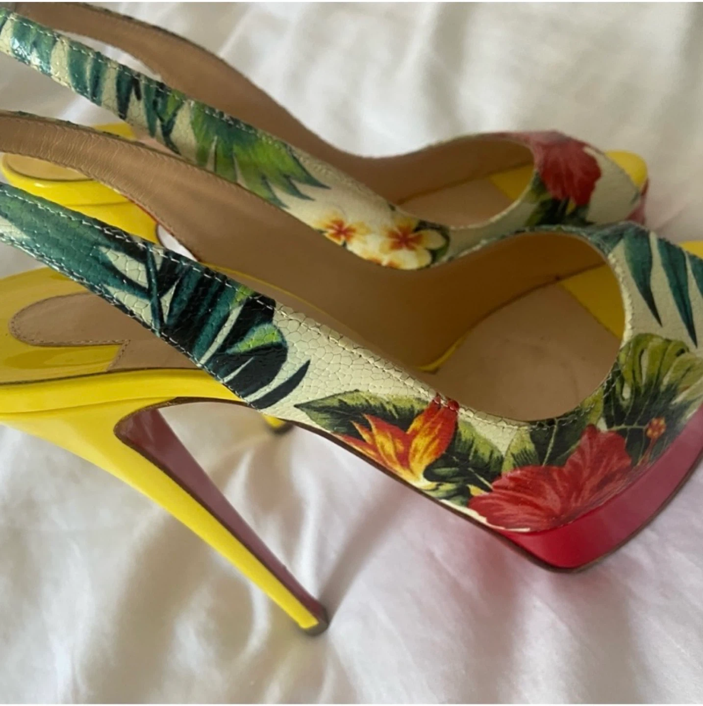 These Christian Louboutin heels feature a vibrant floral pattern with a yellow heel and red sole. They're in great condition and would add a pop of colour to any outfit