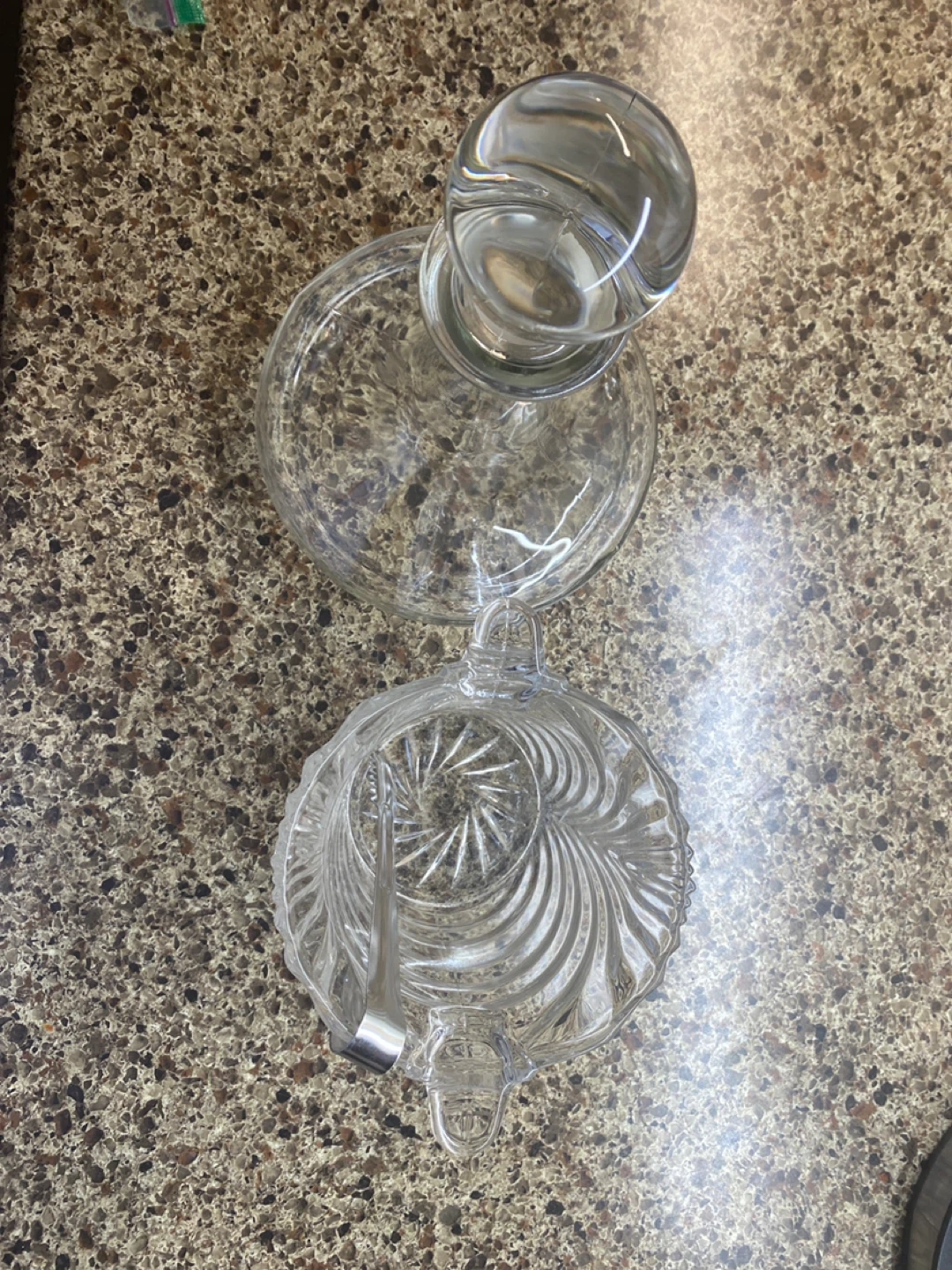 Selling a beautiful crystal decanter and ice bucket set! The decanter features a classic design with a round stopper, and the ice bucket has a lovely patterned texture and comes with tongs and box