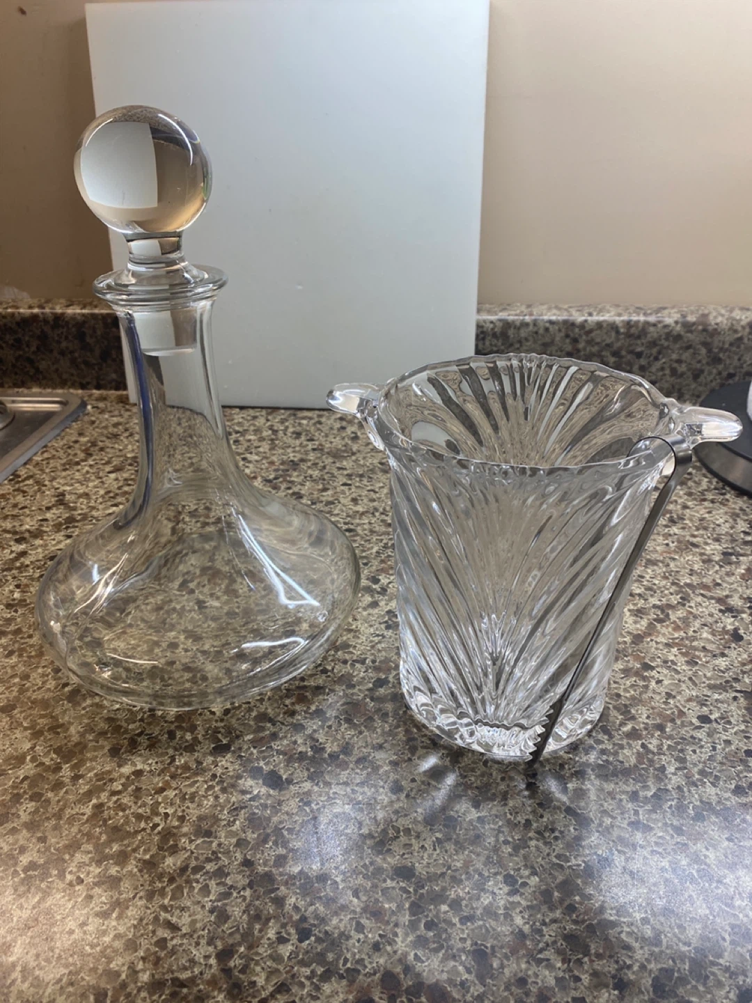 Selling a beautiful crystal decanter and ice bucket set! The decanter features a classic design with a round stopper, and the ice bucket has a lovely patterned texture and comes with tongs and box