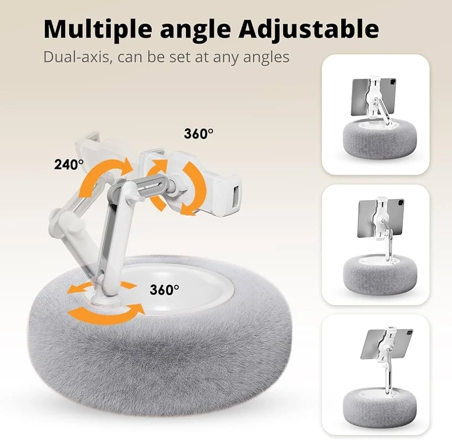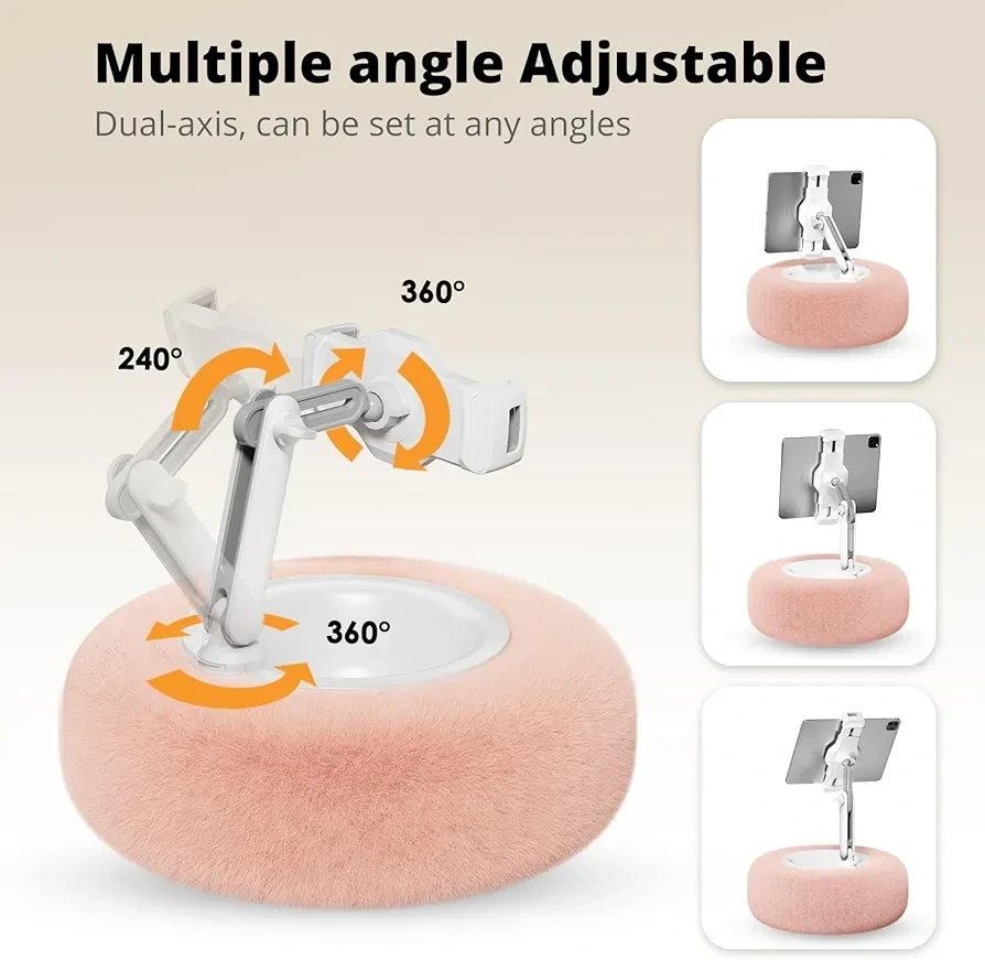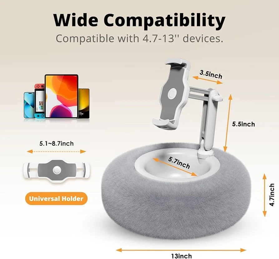 This is a tablet and phone holder with a furry base! It's compatible with 4.7-13" devices. It's angle adjustable and has a storage bowl, and the pillow is washable!