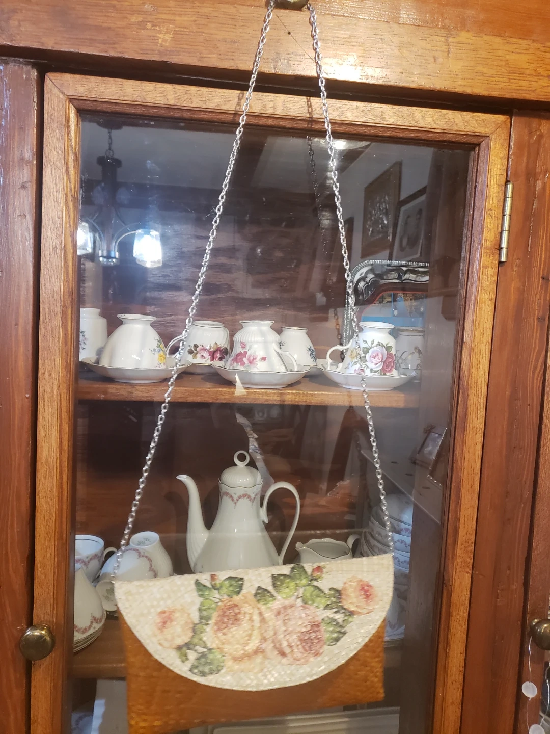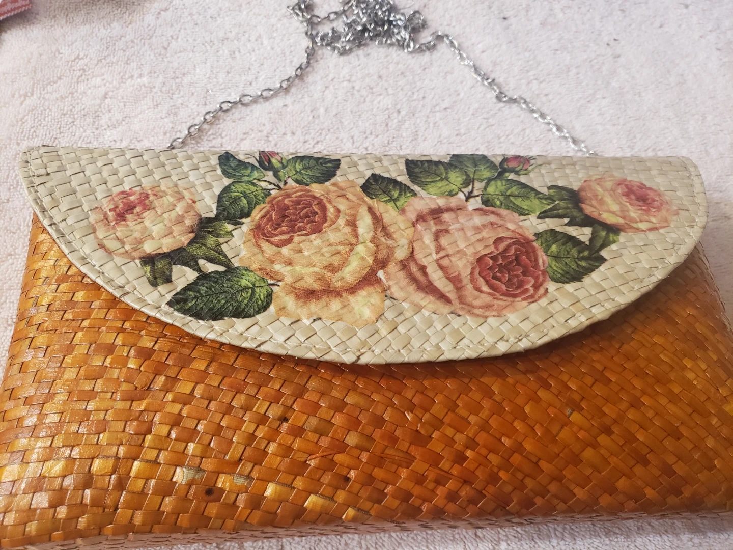 This is a cute floral woven clutch bag! It has a magnetic closure and a chain strap. The clutch is in good condition and ready for a new owner