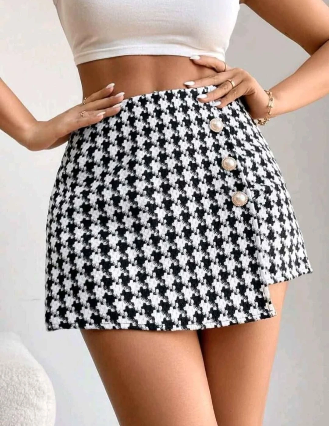 Very high end tweed thick marerial with a classic houndstooth pattern! It has side zipper & three decorative buttons on the front. Perfect for adding sofistcated flair to any outfit