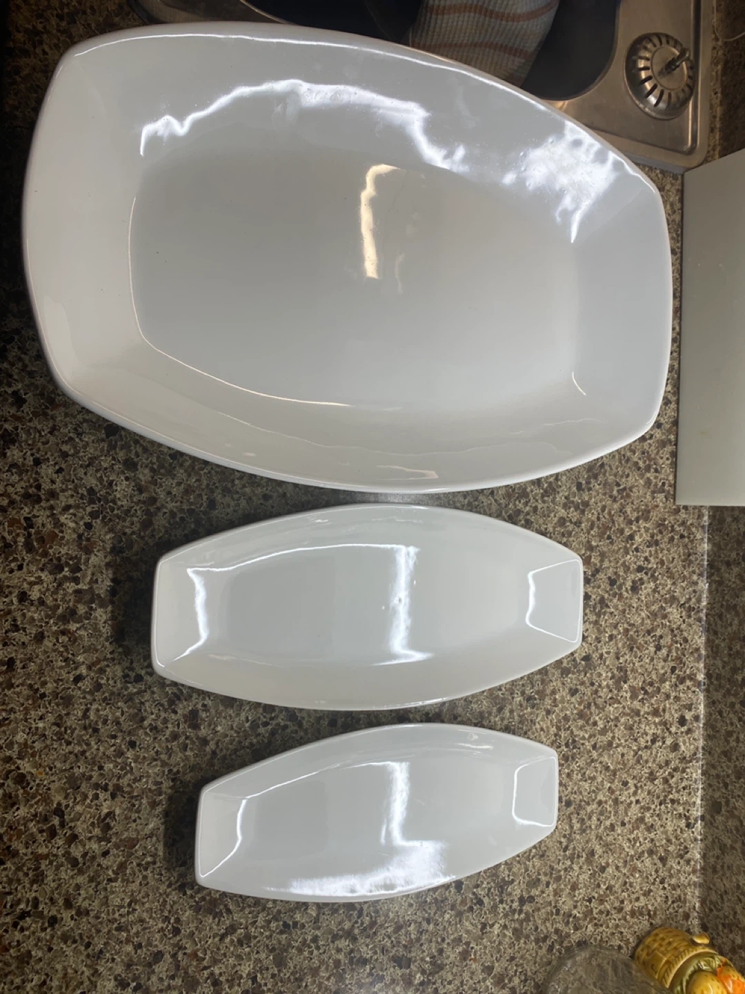 Selling a set of three white serving platters! They are in great condition and perfect for entertaining or everyday use. The set includes a large platter and two smaller ones.