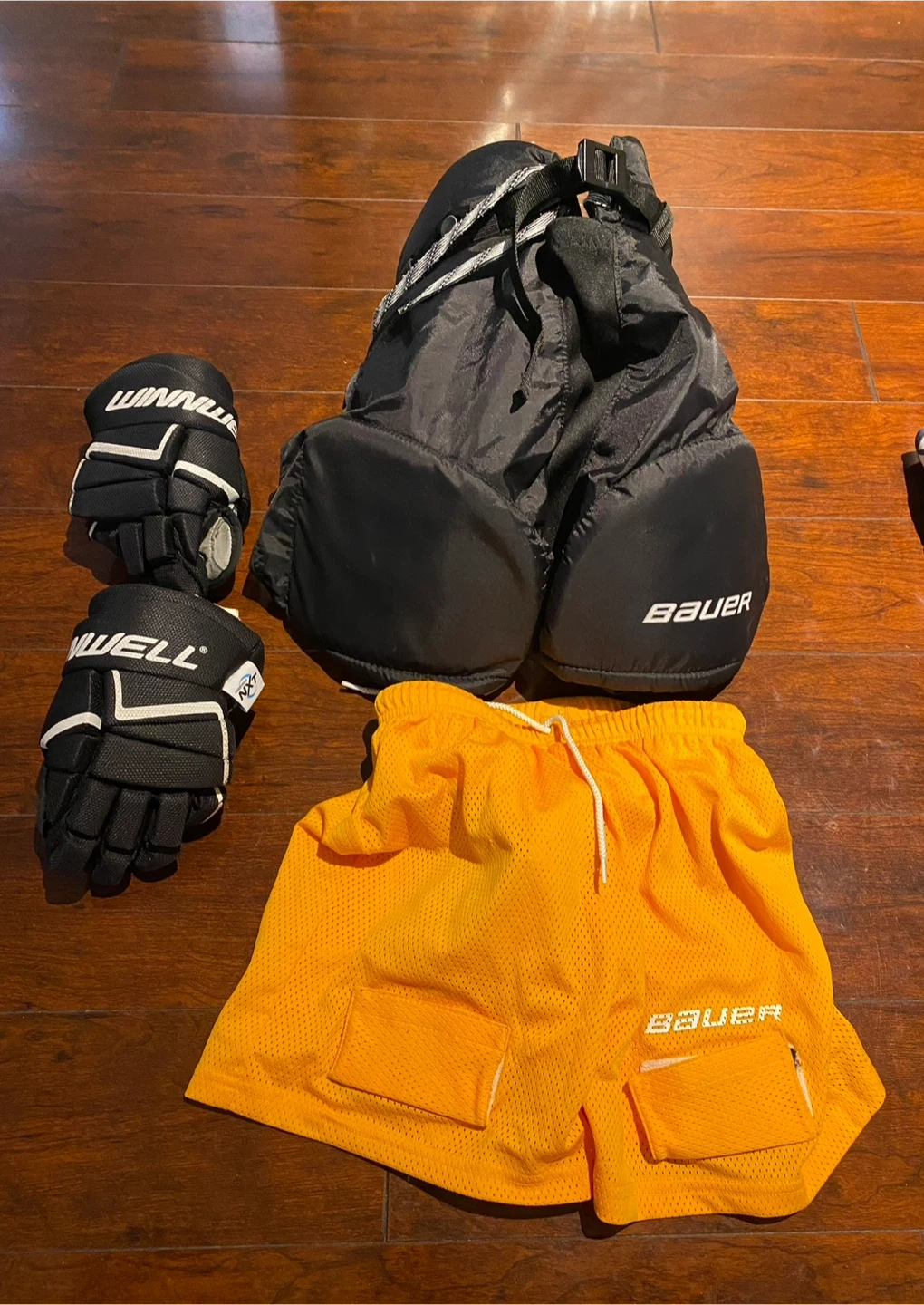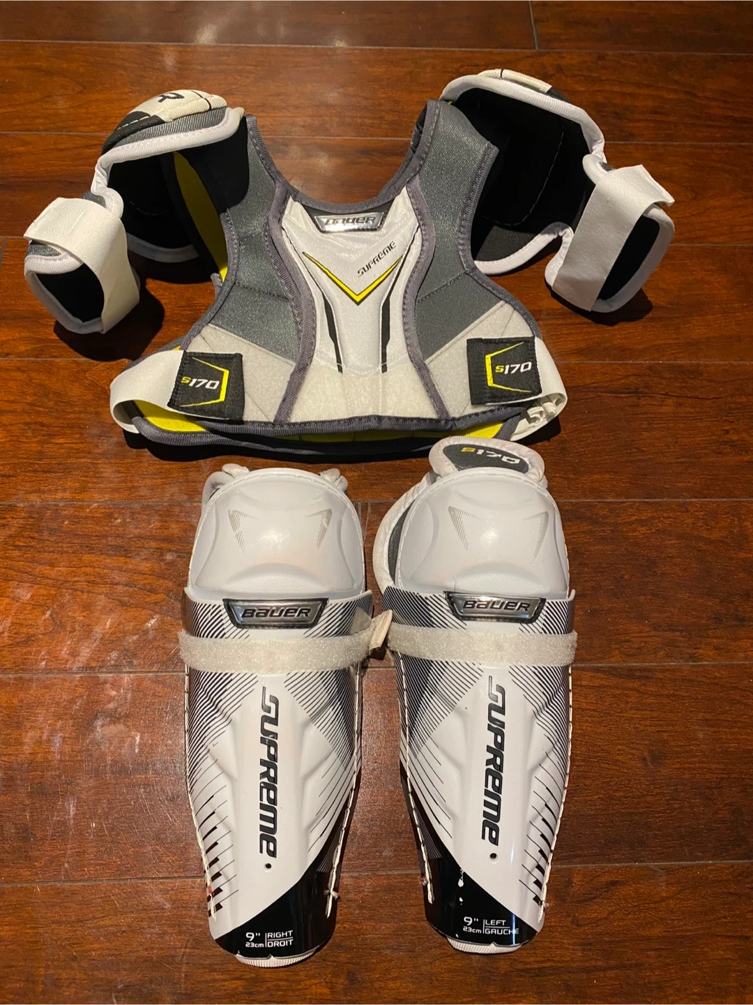 Selling a set of hockey protective gear including Bauer Supreme shin guards (9" / 23cm), Bauer S170 shoulder pads (M/M), and Winnwell gloves. All in good condition and ready for the rink!