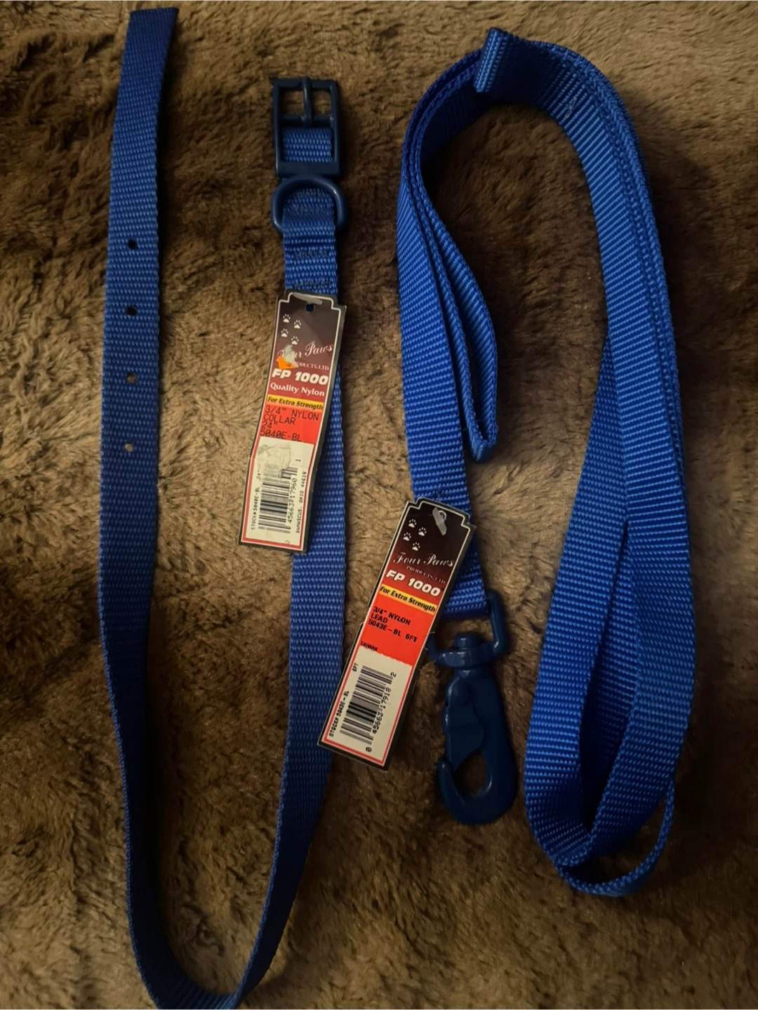 Selling a new Four Paws FP 1000 dog collar and leash set in blue! The collar is a 3/4" nylon collar, and the leash is a 3/4" nylon lead that is 6 feet long. Both are made for extra strength.