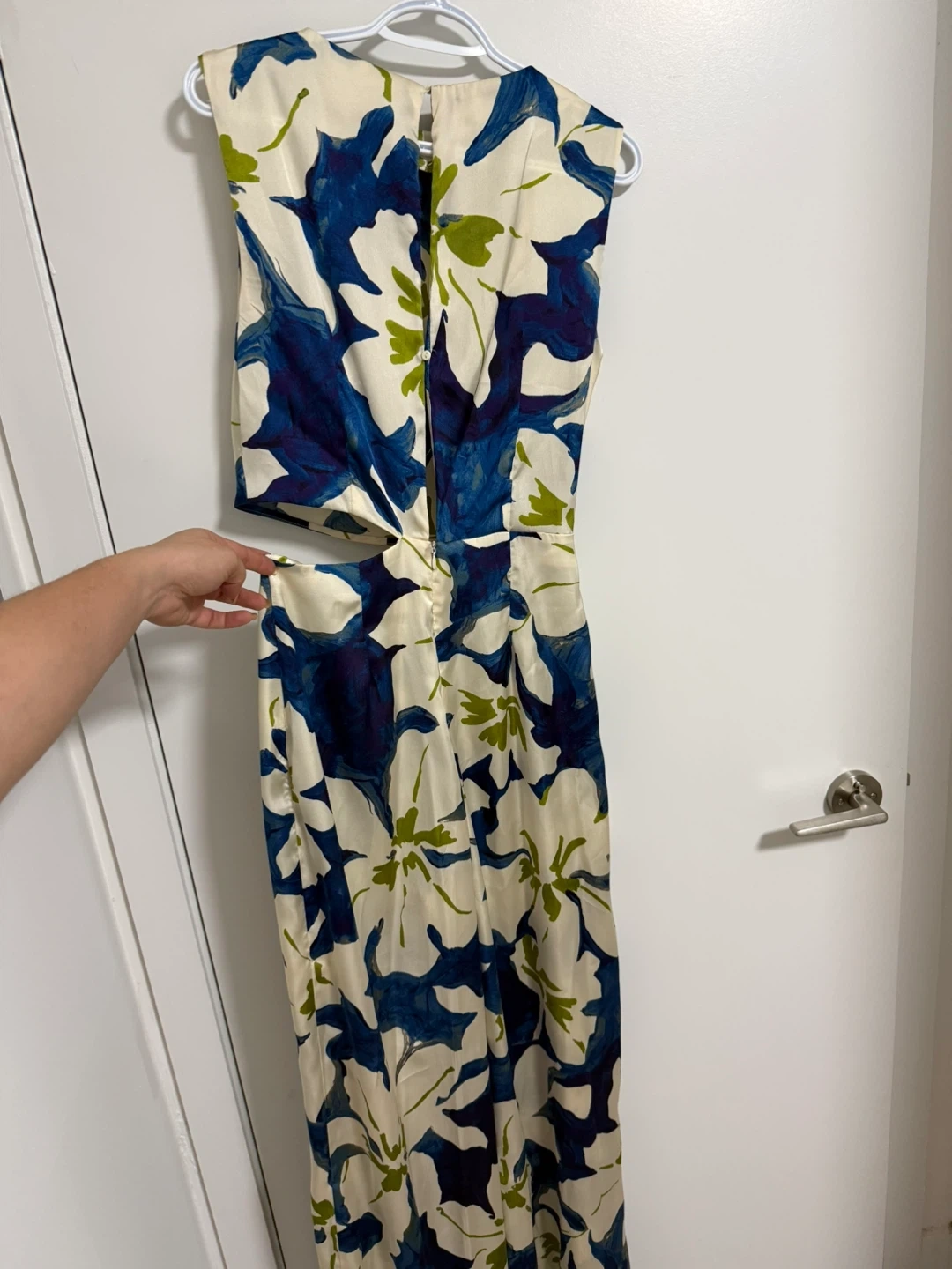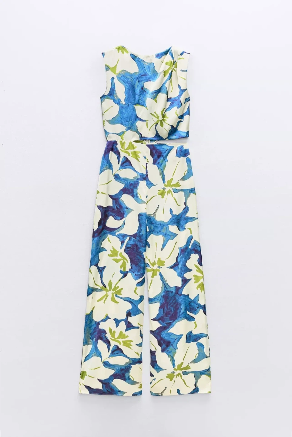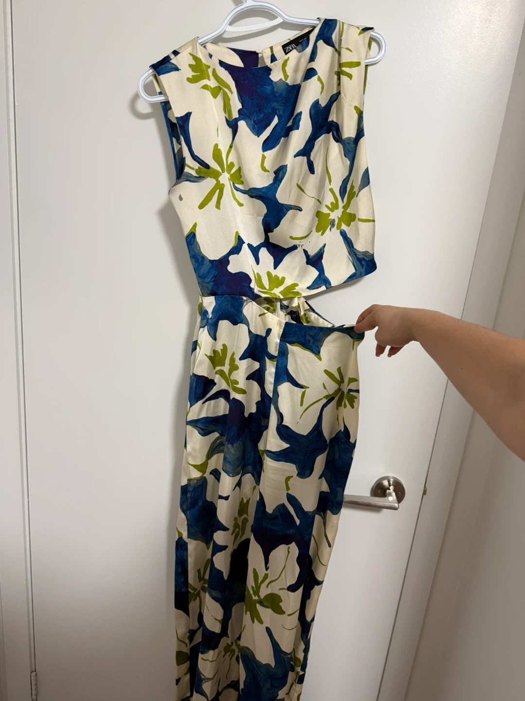 Selling a Zara floral print jumpsuit in size small. The jumpsuit features a beautiful blue and white floral pattern with a side cut-out. Perfect for a stylish and comfortable look!