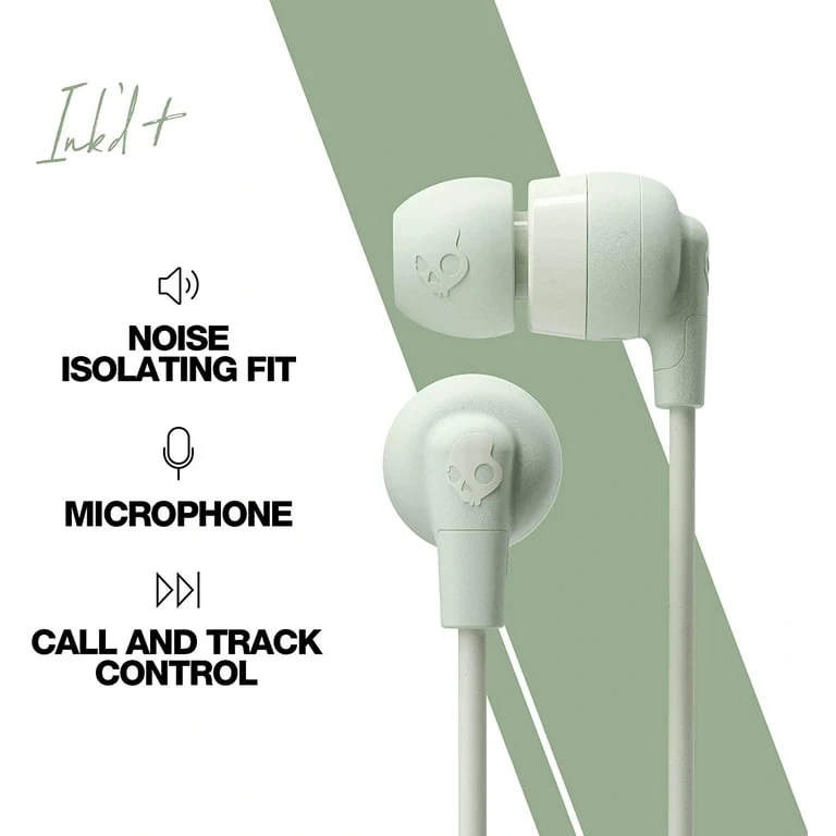 Check out these Skullcandy Ink'd+ wireless earbuds in a cool green colour! They feature a noise-isolating fit, a built-in microphone, and call and track control. Perfect for listening to your favourite tunes on the go!