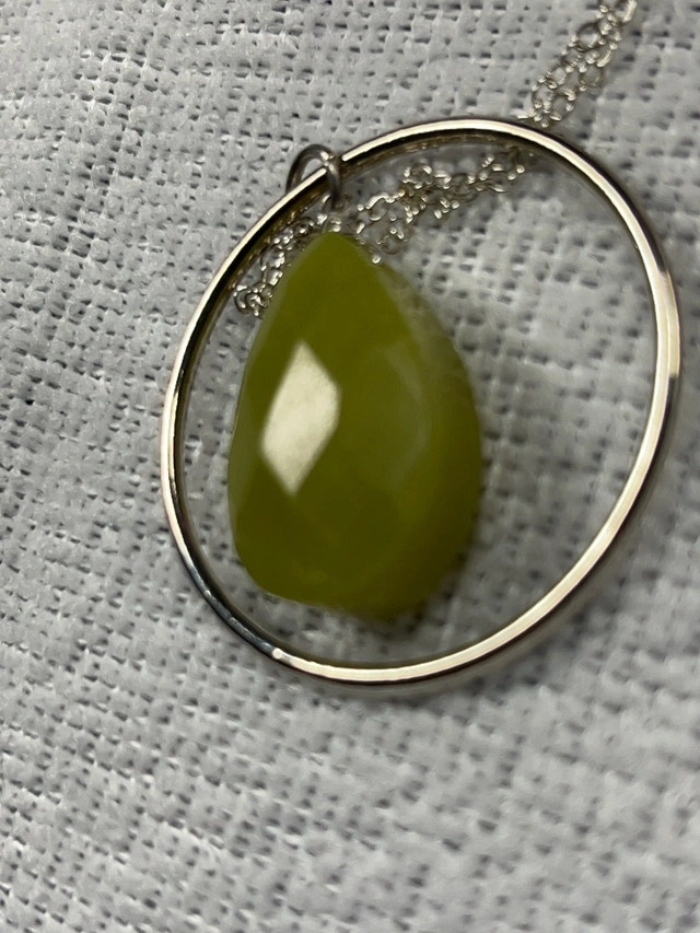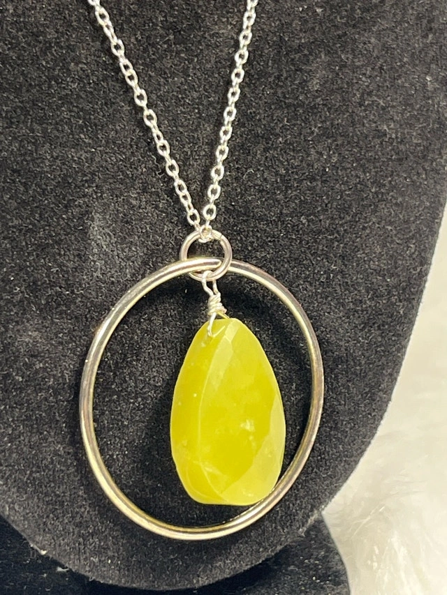 This is a pendant necklace featuring a beautiful yellow teardrop stone, elegantly wire-wrapped in a silver-tone ring and chain. This item is in used condition. Here are some additional details: