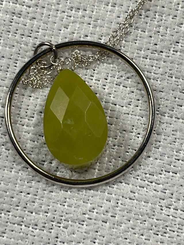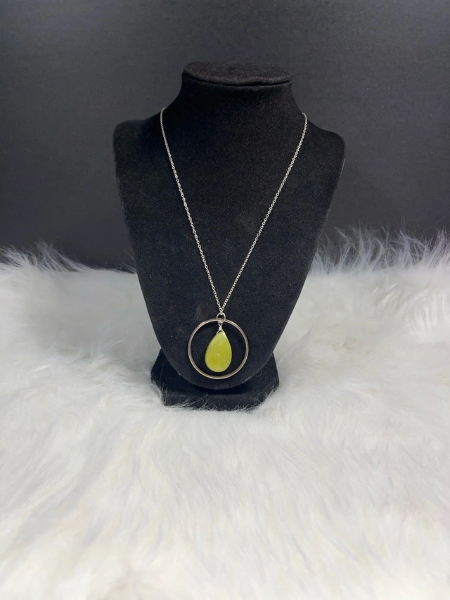 This is a pendant necklace featuring a beautiful yellow teardrop stone, elegantly wire-wrapped in a silver-tone ring and chain. This item is in used condition. Here are some additional details: