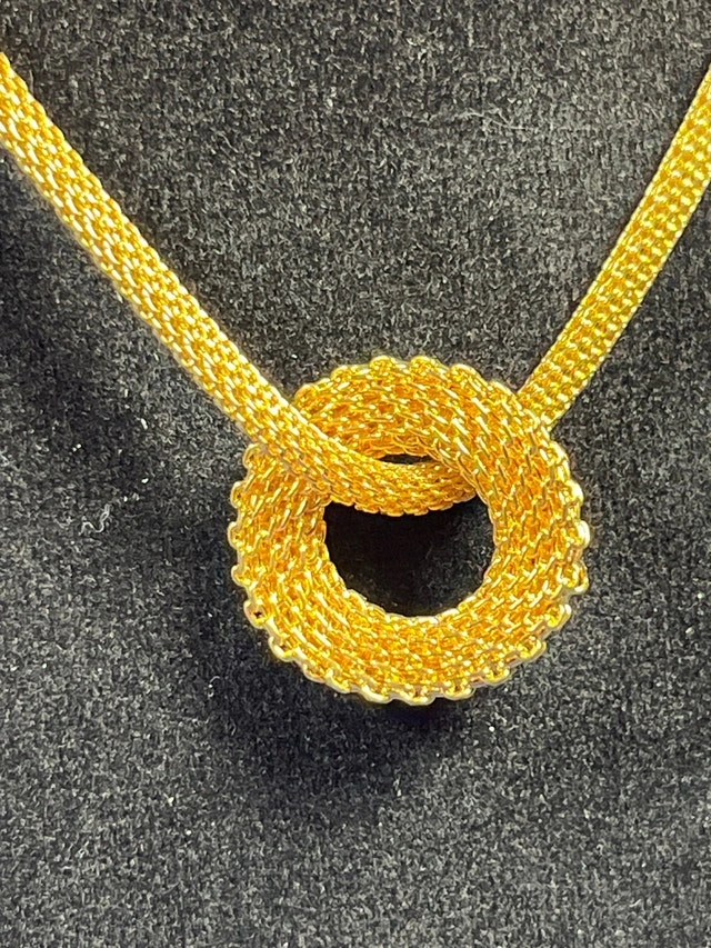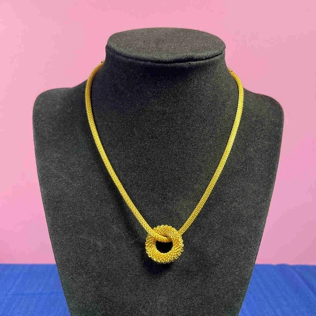 This is a beautiful gold tone necklace, perfect for adding a touch of elegance to any outfit. It has a unique looped pendant design and an adjustable chain length for a comfortable fit. This necklace is in good condition, ready to be worn and enjoyed.
