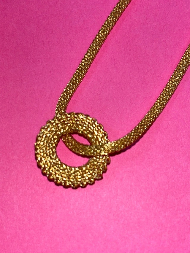 This is a beautiful gold tone necklace, perfect for adding a touch of elegance to any outfit. It has a unique looped pendant design and an adjustable chain length for a comfortable fit. This necklace is in good condition, ready to be worn and enjoyed.
