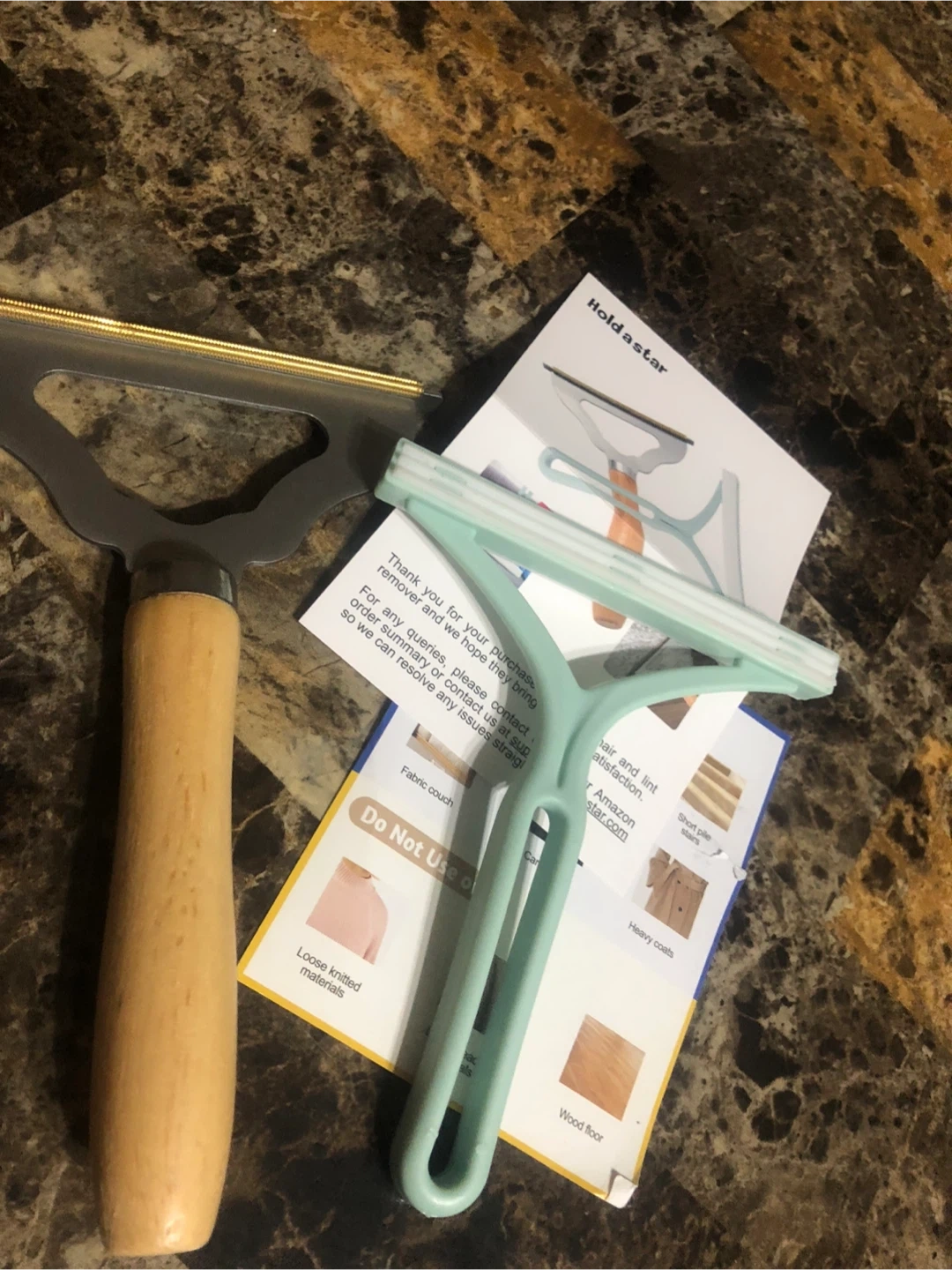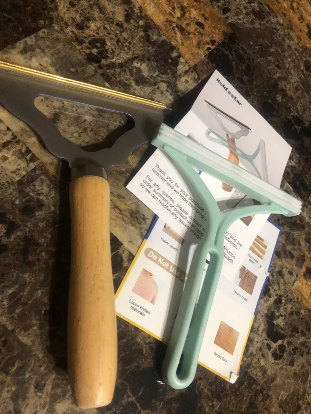 I'm selling a new Hold a star fabric shaver set. One is a copper head scraper with a wooden handle, great for heavy duty and thick-piled items such as carpets and pet beds. The other is a light green plastic scraper. Perfect for removing fuzz and lint away!