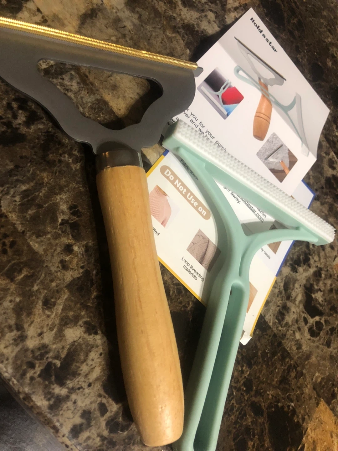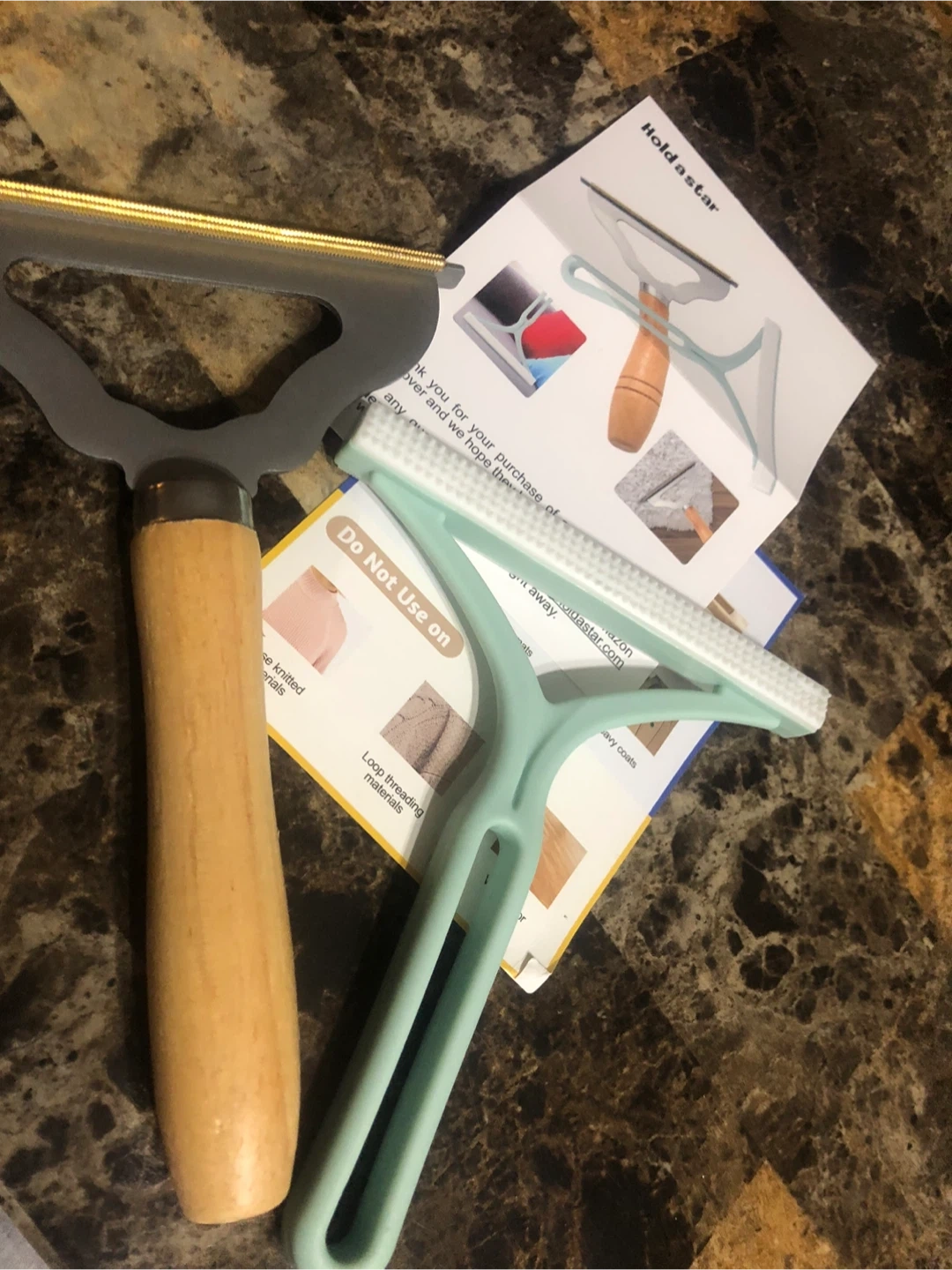 I'm selling a new Hold a star fabric shaver set. One is a copper head scraper with a wooden handle, great for heavy duty and thick-piled items such as carpets and pet beds. The other is a light green plastic scraper. Perfect for removing fuzz and lint away!