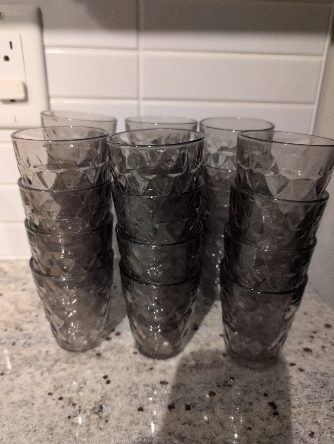 Selling a set of 24 smoke grey glasses. They have a nice textured design and are in great shape! ☺️