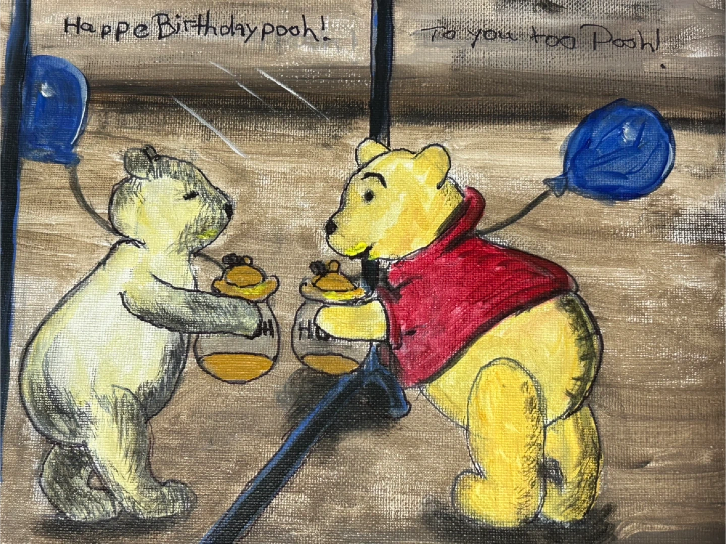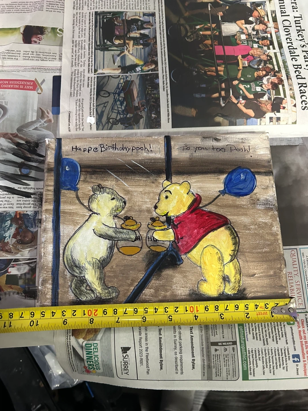 8inch x10inch acrylic painting of Winnie the Pooh saying happy birthday to Winnie the Pooh through a mirror. Sorry no refunds. Cash or e-transfer only. Payment to be made at pick up. Pick up
