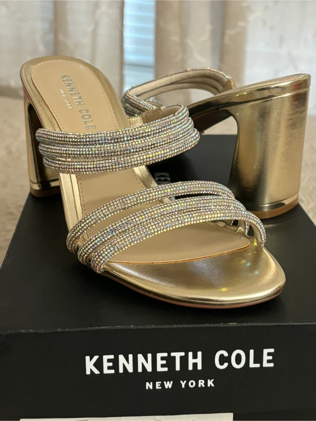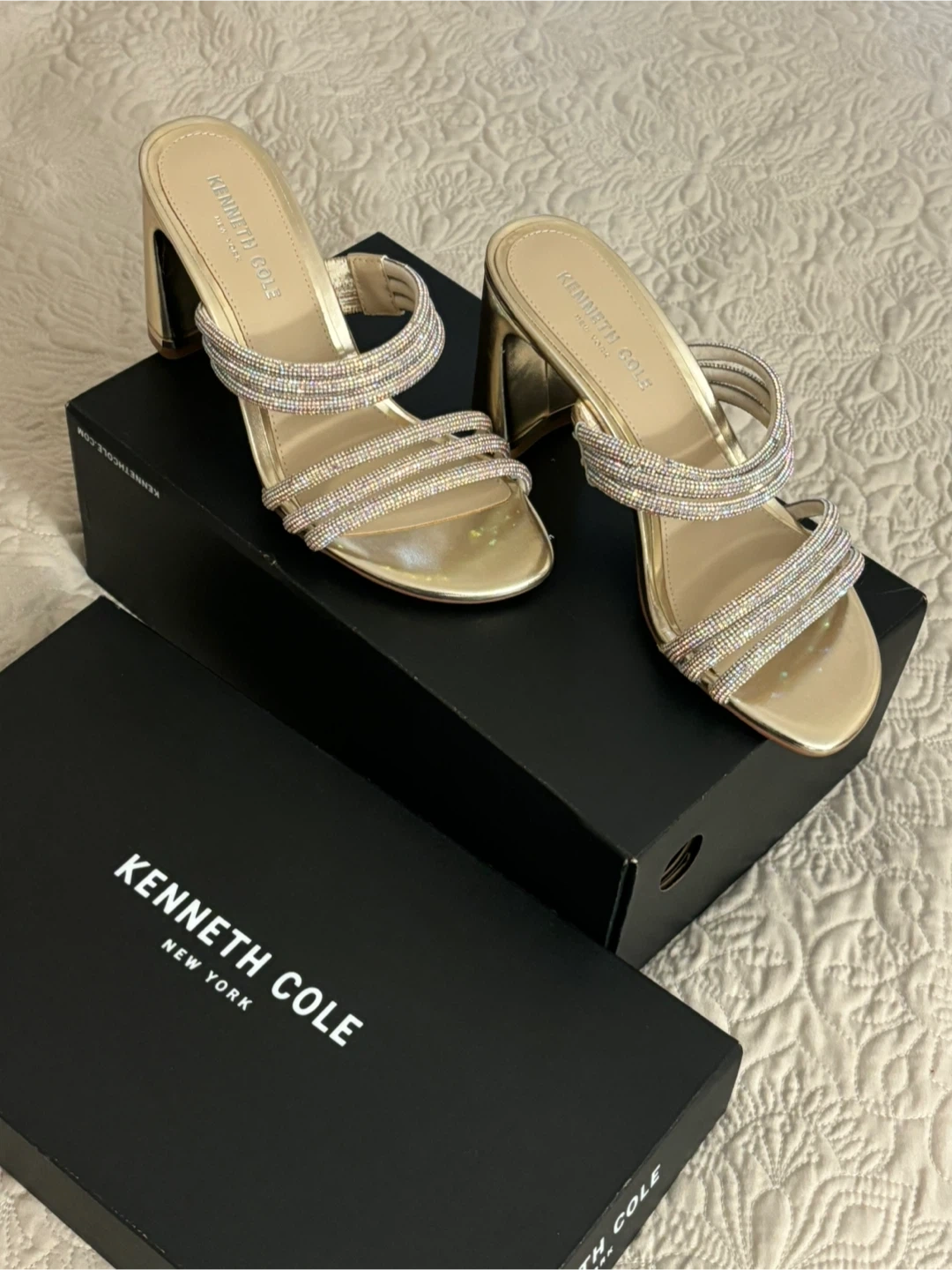 These are a pair of beautiful Kenneth Cole gold heels in a size 7! They feature sparkly straps and a block heel. Comes with the original box!