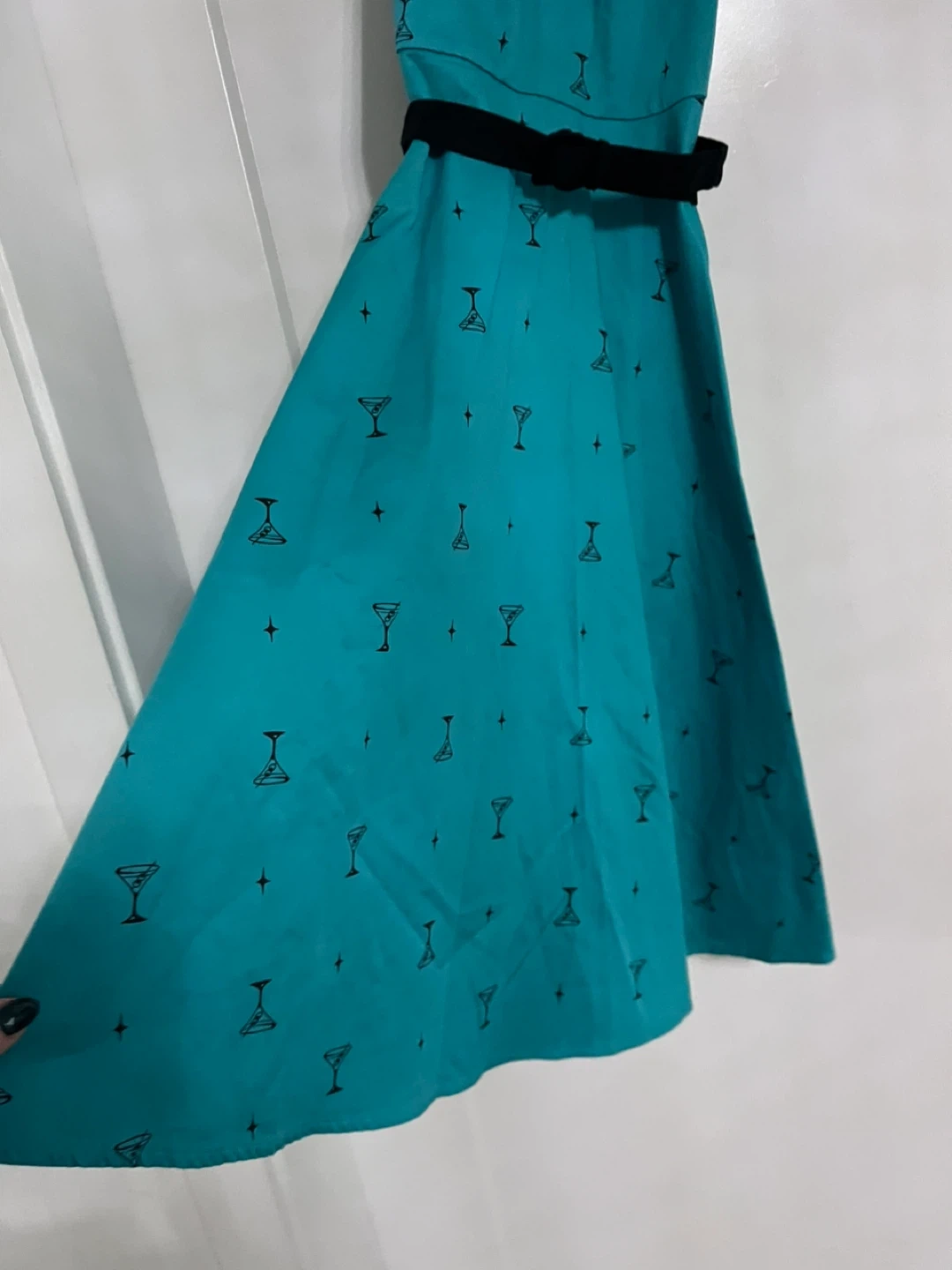 Retro pinup brand dress in a size small! It's a teal colour with a black collar, tie, and belt. The dress has a fun cocktail glass pattern all over it. Perfect for a night out! Cotton material with slight stretch!