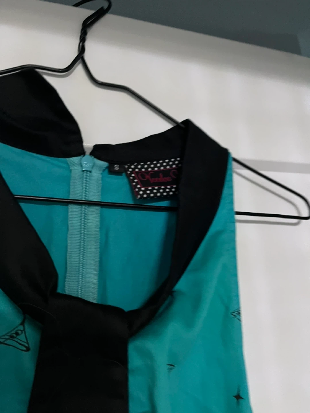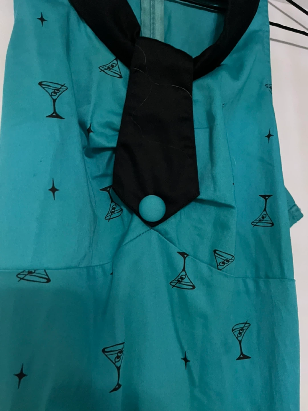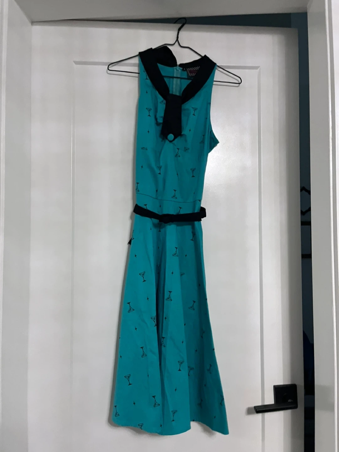 Retro pinup brand dress in a size small! It's a teal colour with a black collar, tie, and belt. The dress has a fun cocktail glass pattern all over it. Perfect for a night out! Cotton material with slight stretch!
