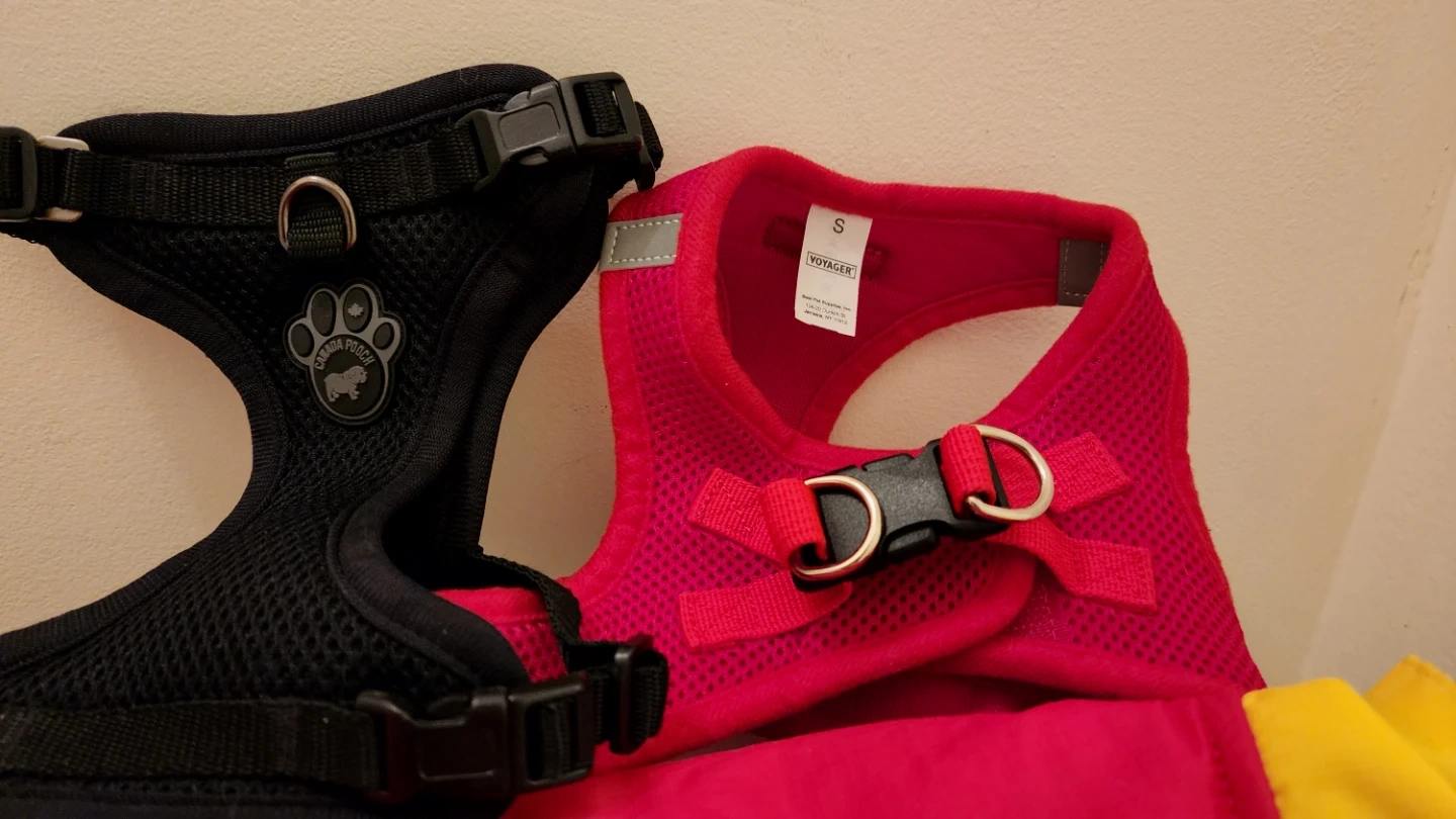1-Two dog harnesses for sale! One is a Red Voyager harness, size small. The other is a black harness from Canada Pooch. Both are in great shape and ready for your furry friend!