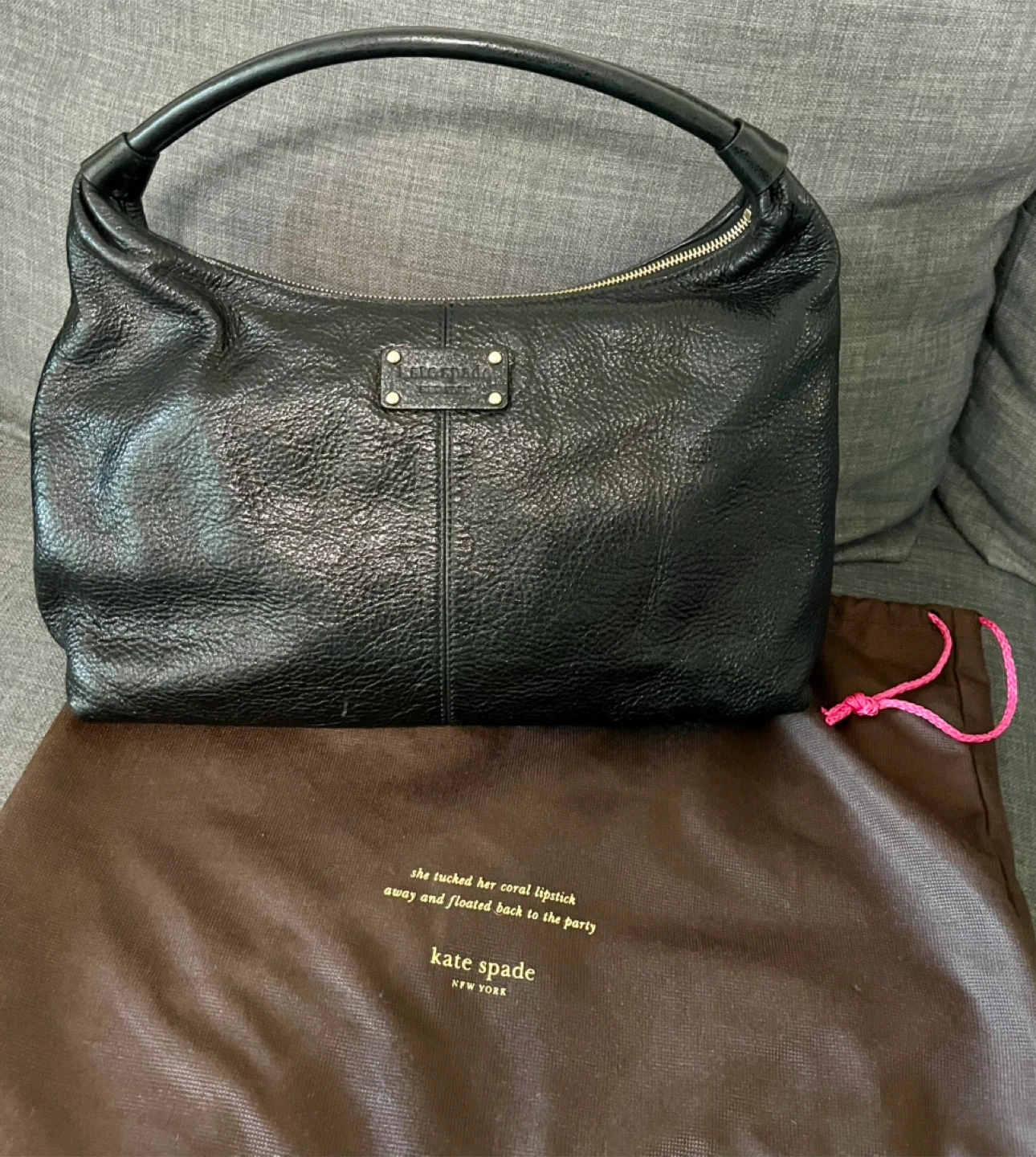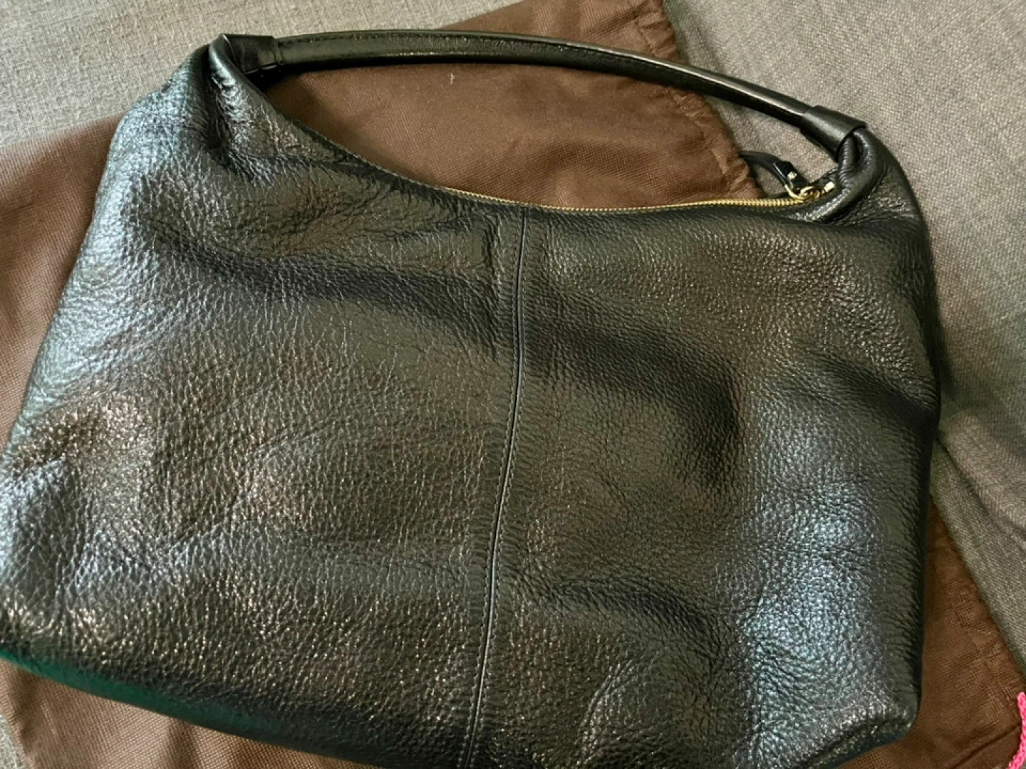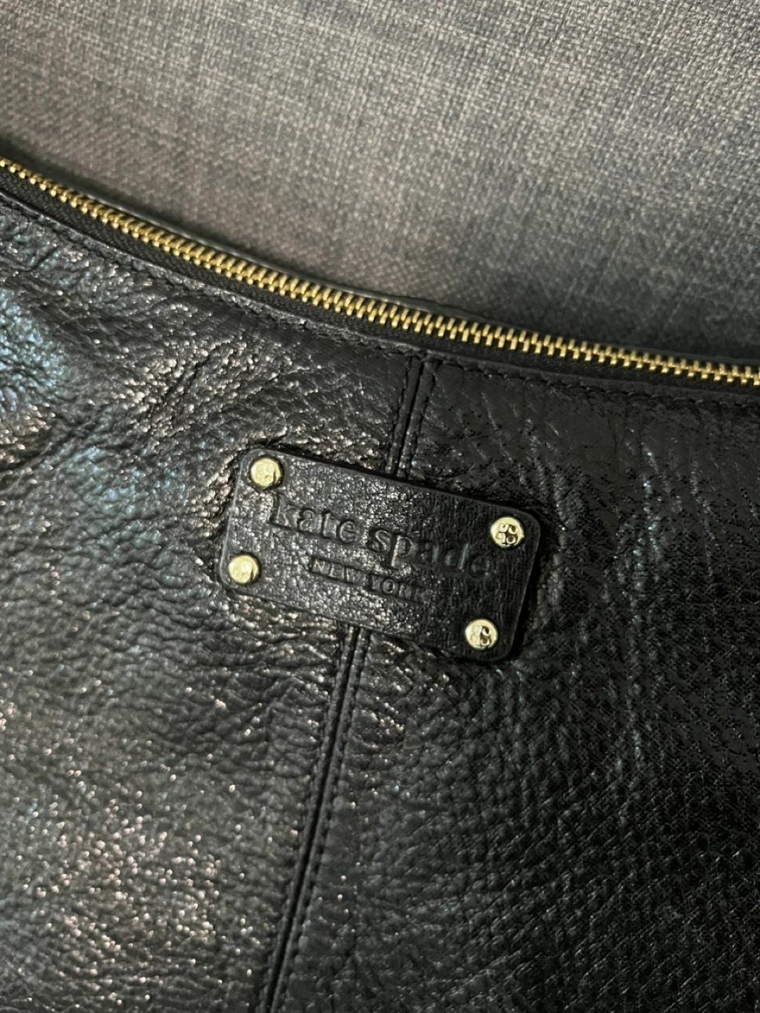 Leather has a sparkle through it! I’ve never seen one like it! Just too large for my petite frame in my opinion! Has been stored on a shelf Is as the day it arrived.