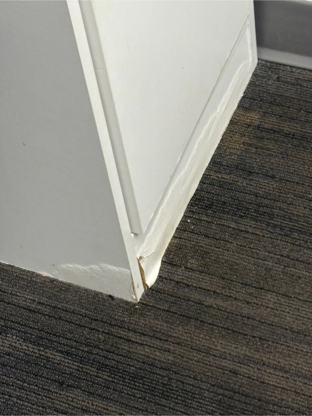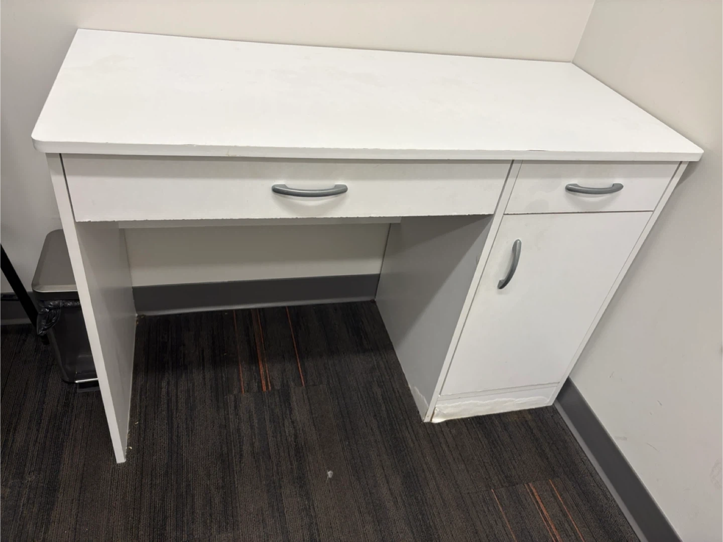 Selling a white desk that's perfect for a home office or study space. It features a handy drawer and a cabinet for extra storage. There are some signs of wear and tear on the bottom, as shown in the pictures.