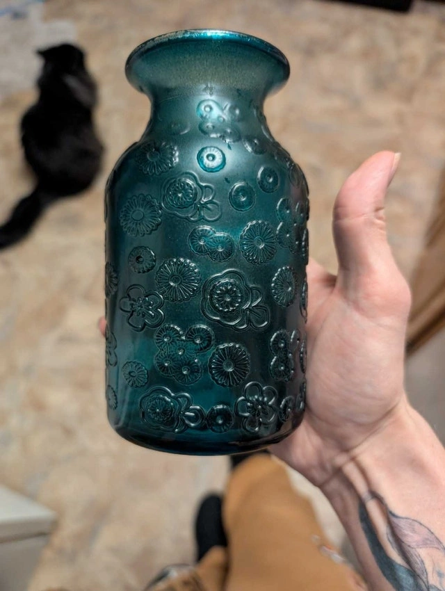 This elegant vase features a teal colour with floral detailing, making it a beautiful decorative piece for any home. It is in used, but good, condition. This item will add charm to your decor. If the ad is still up, it's still available!