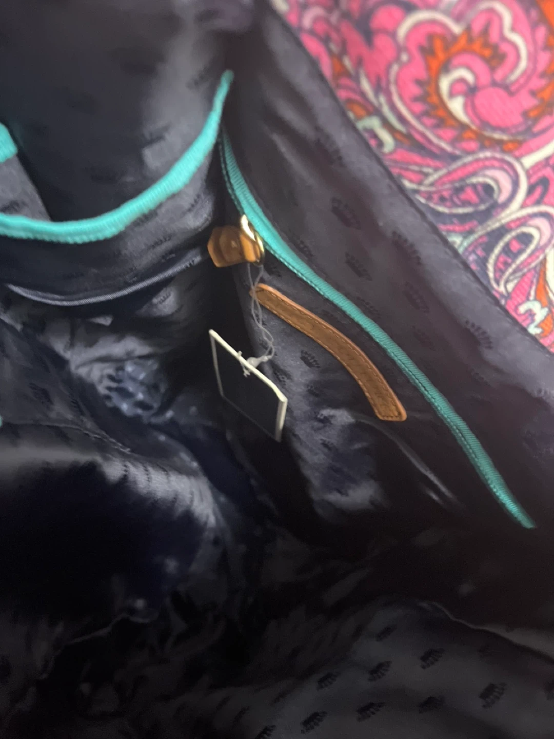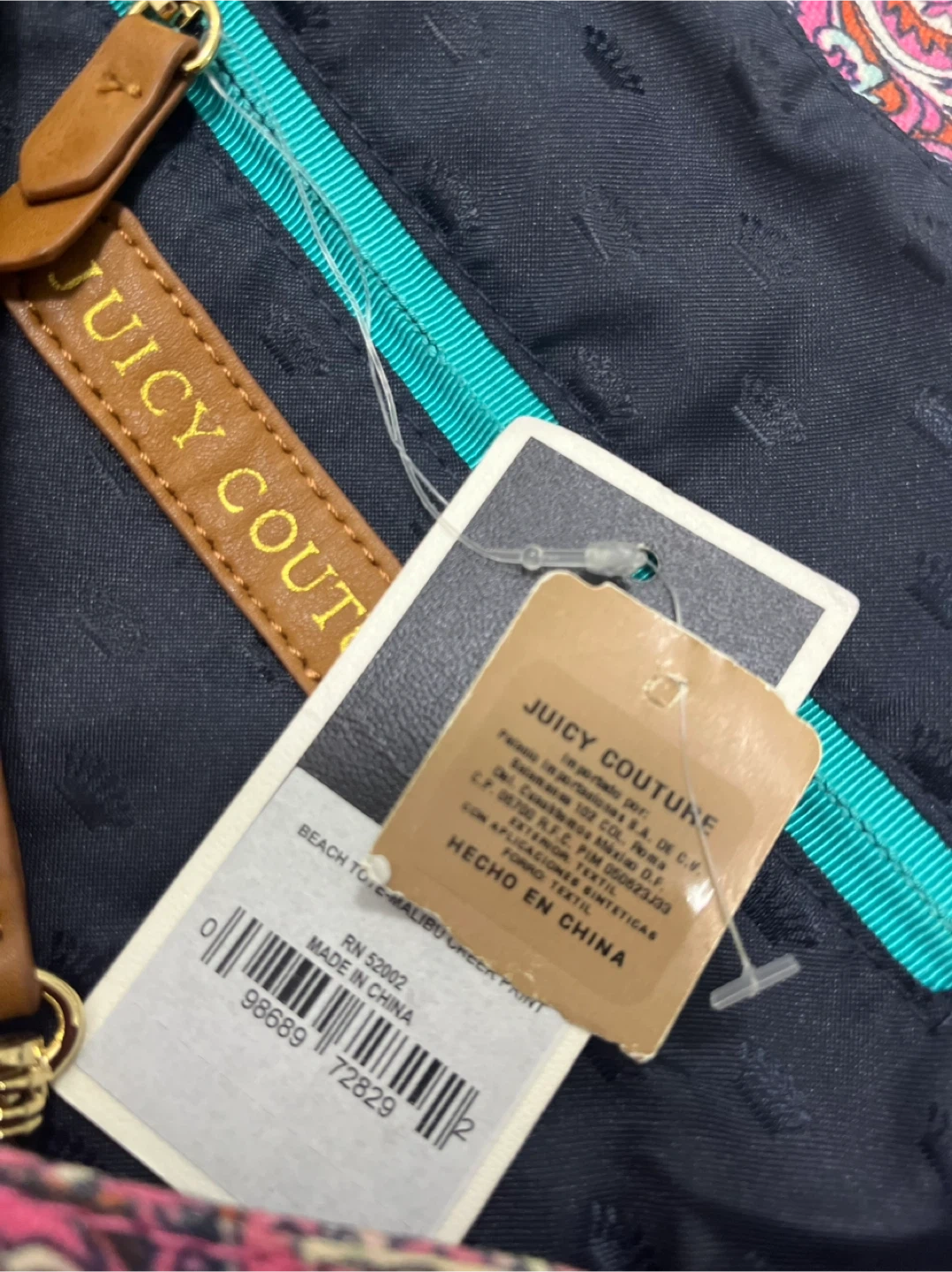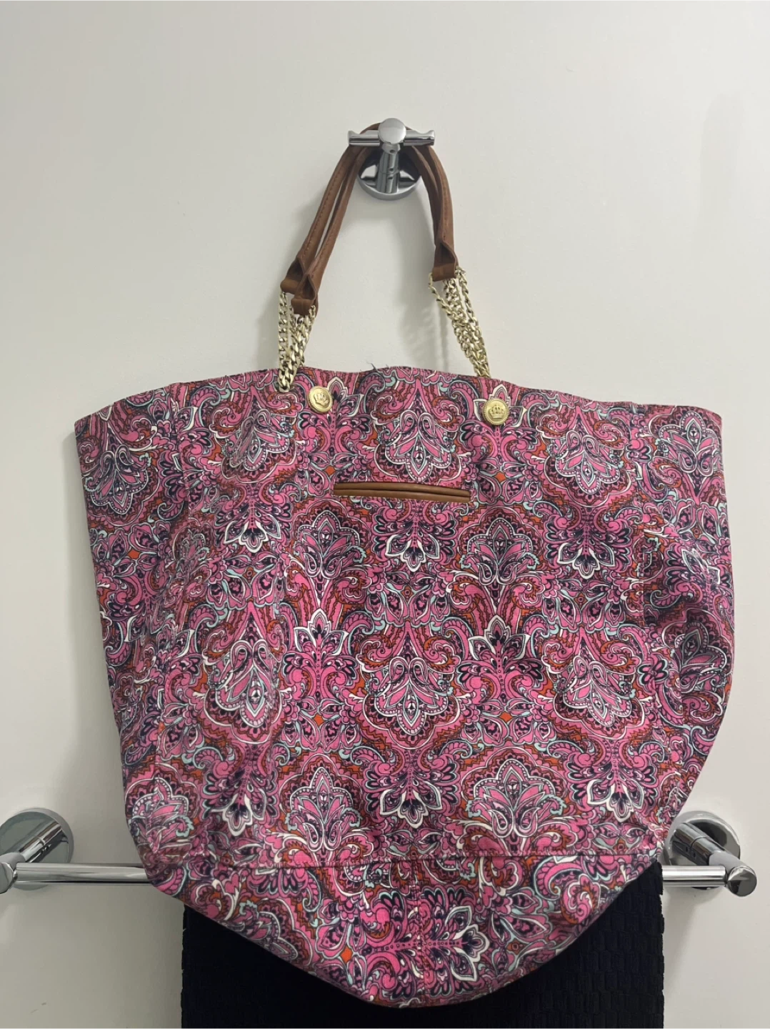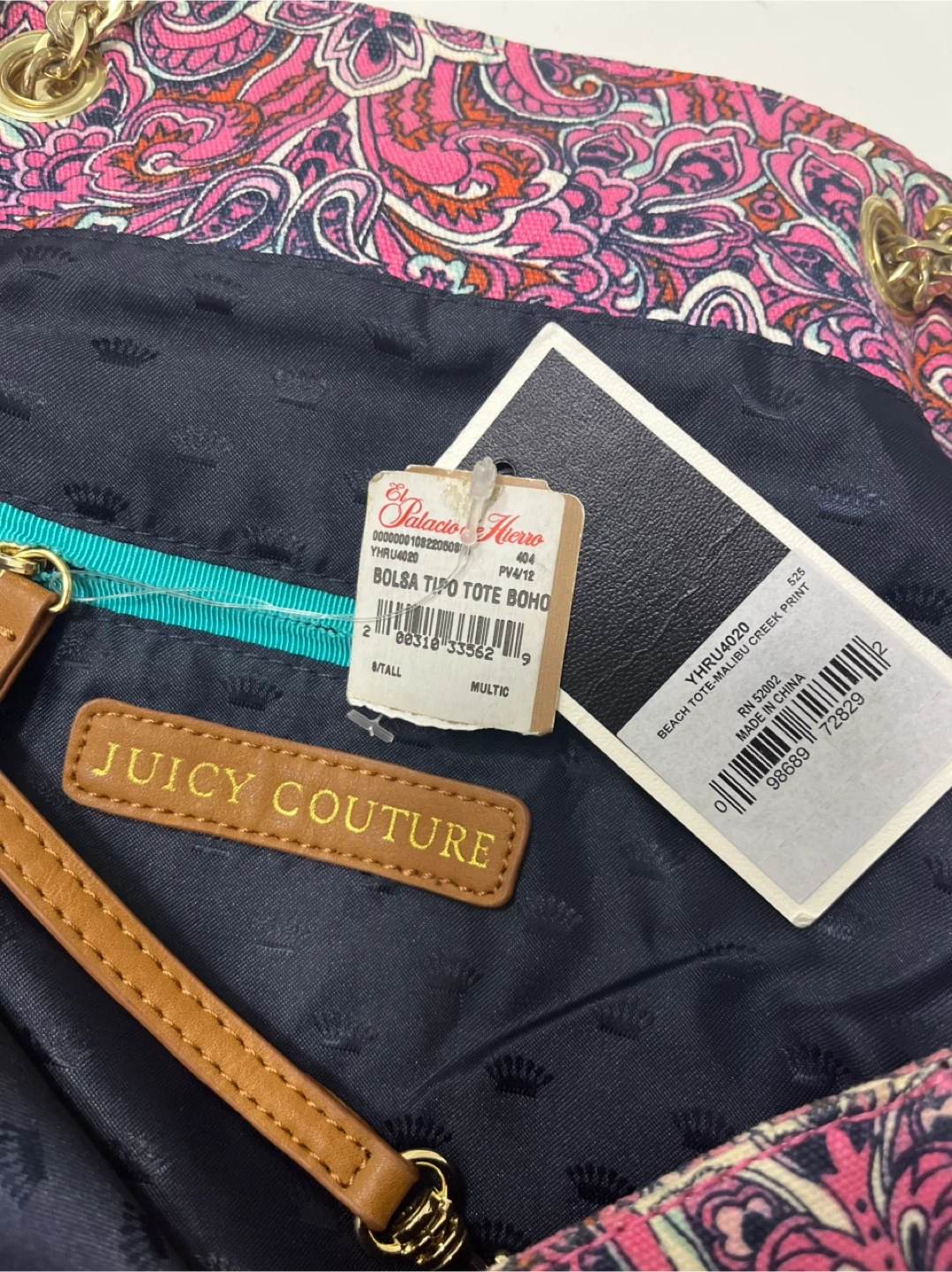 Juicy Couture tote bag with a colourful pink paisley design. It has gold chain details on the straps and brown leather accents.