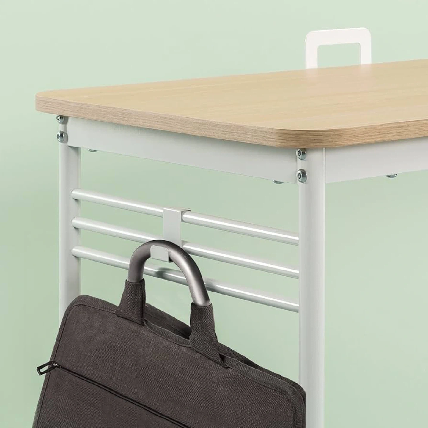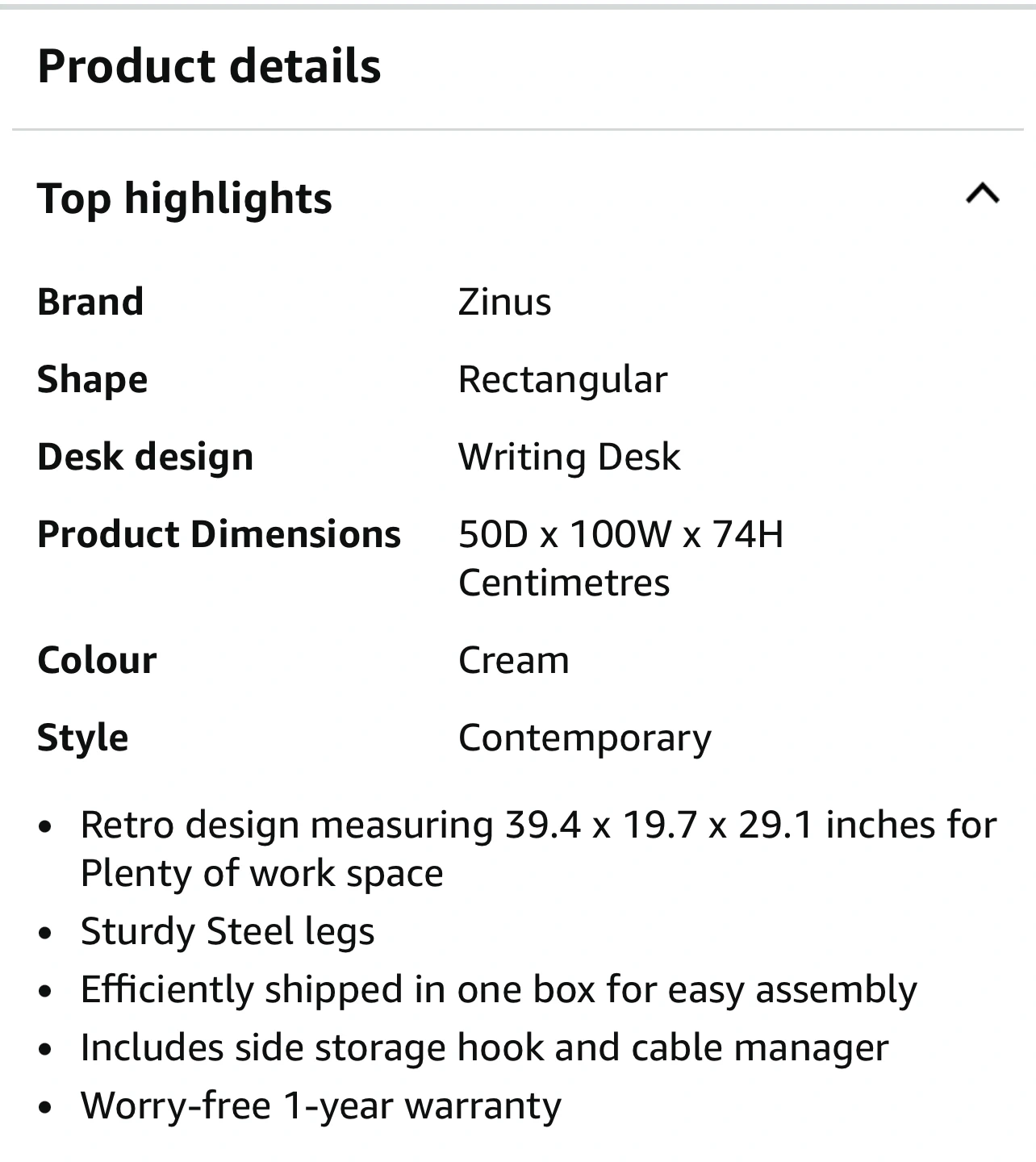 Selling a desk with a wood top and a white metal frame. It's in great shape and measures 39.4" wide, 19.7" deep, and 29.1" high. It also has a handy hook for hanging a bag or cables