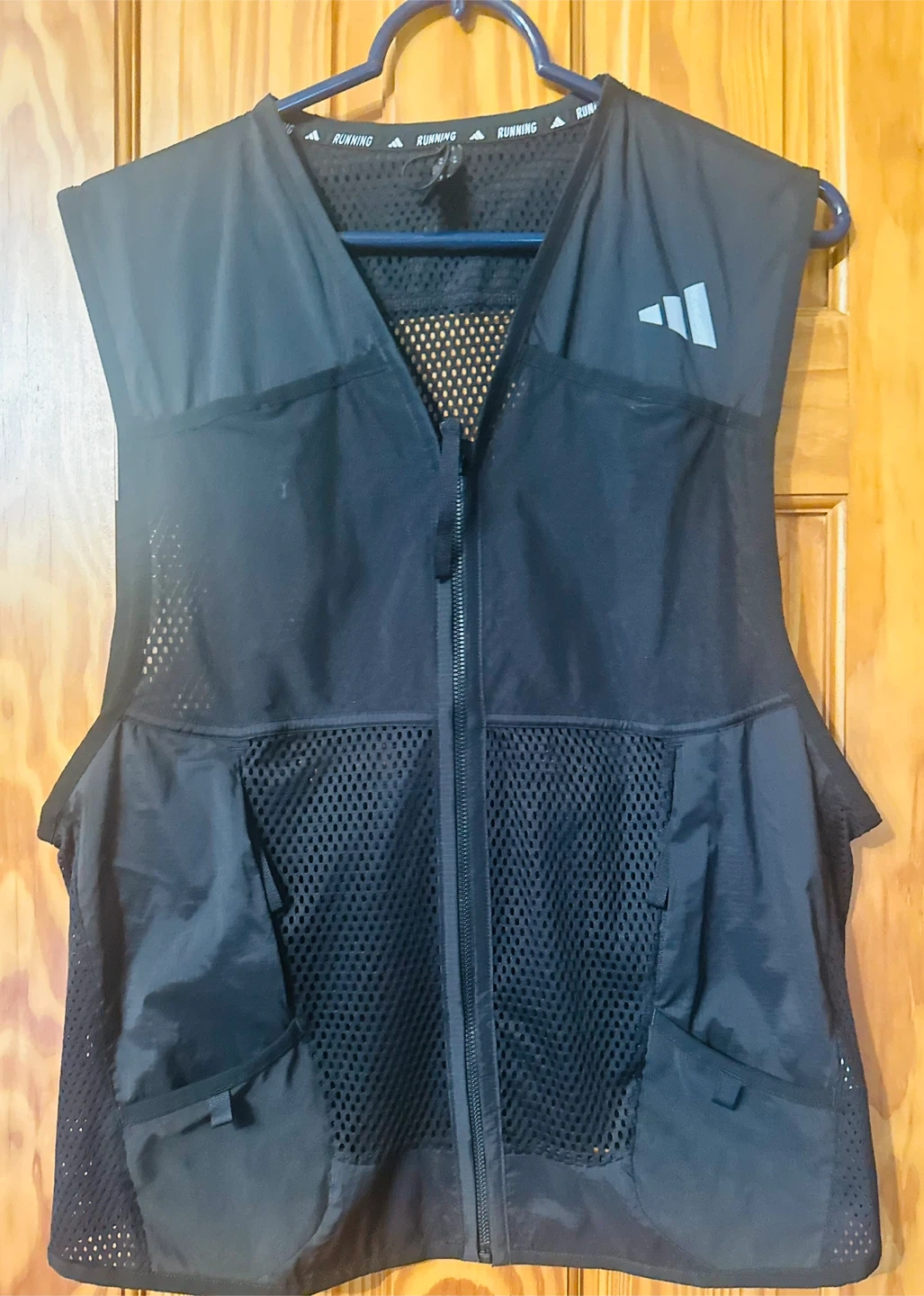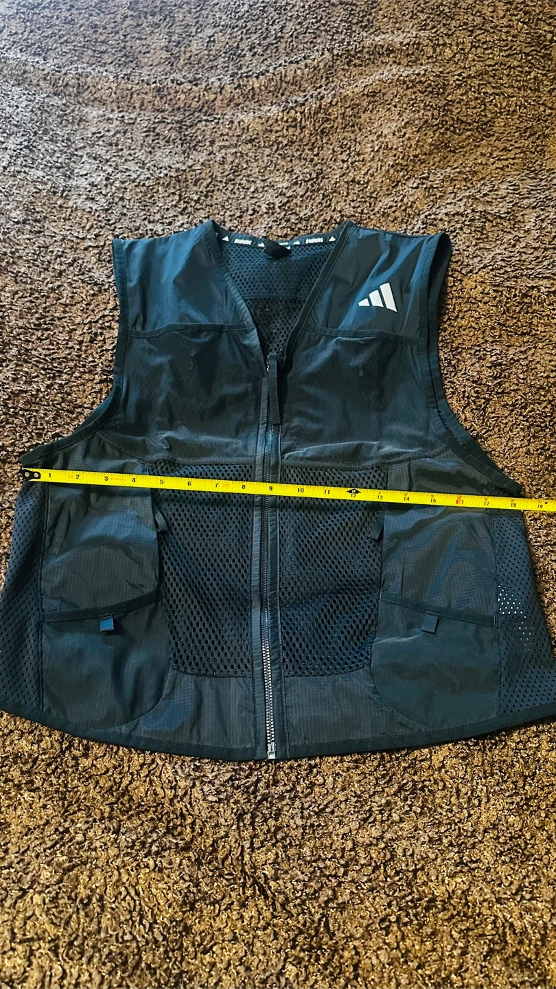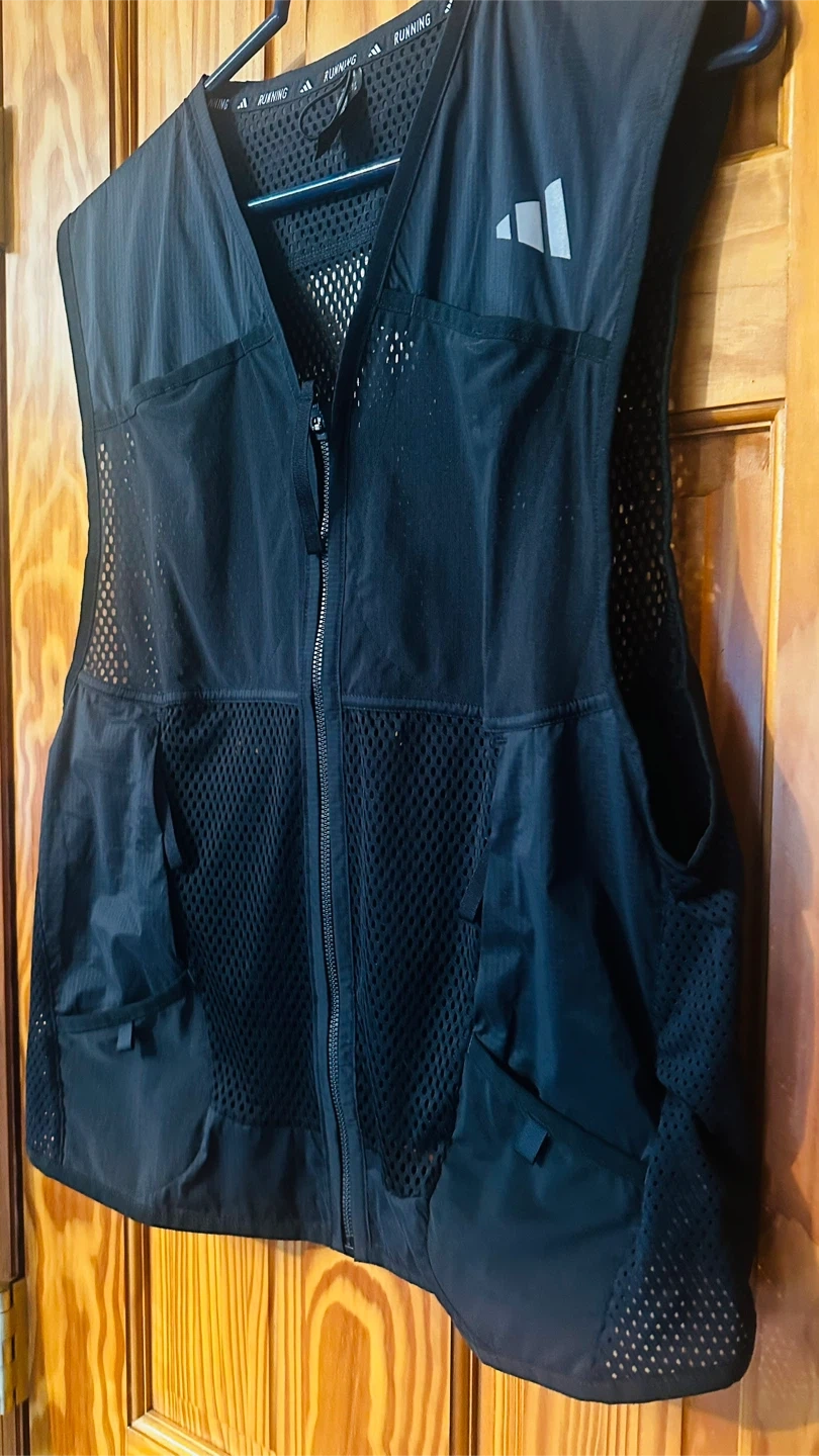 Adidas running vest in size M. Perfect for outdoor activities and keeping essentials close while you're on the go! The vest is black and features the Adidas logo.