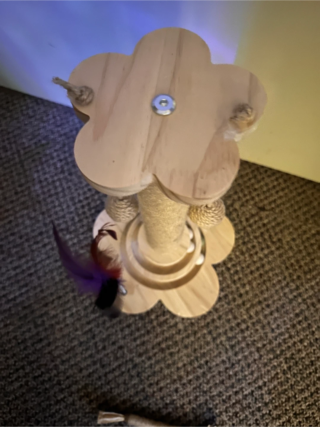 Sisal scratch post, 2 ball chase rings, and 2 hanging balls. 3 in 1 activities that can keep cats amused for hours—and take care of scratching needs as well. Never used by my cat. She’s been ignoring it since I got it for her.