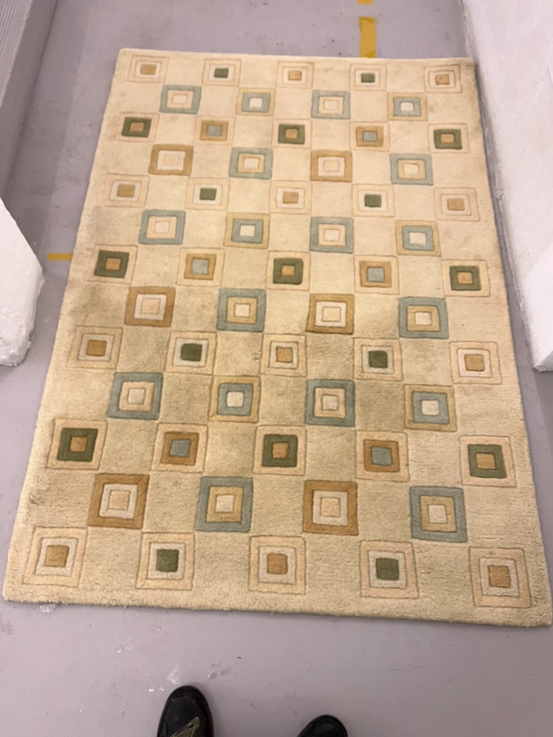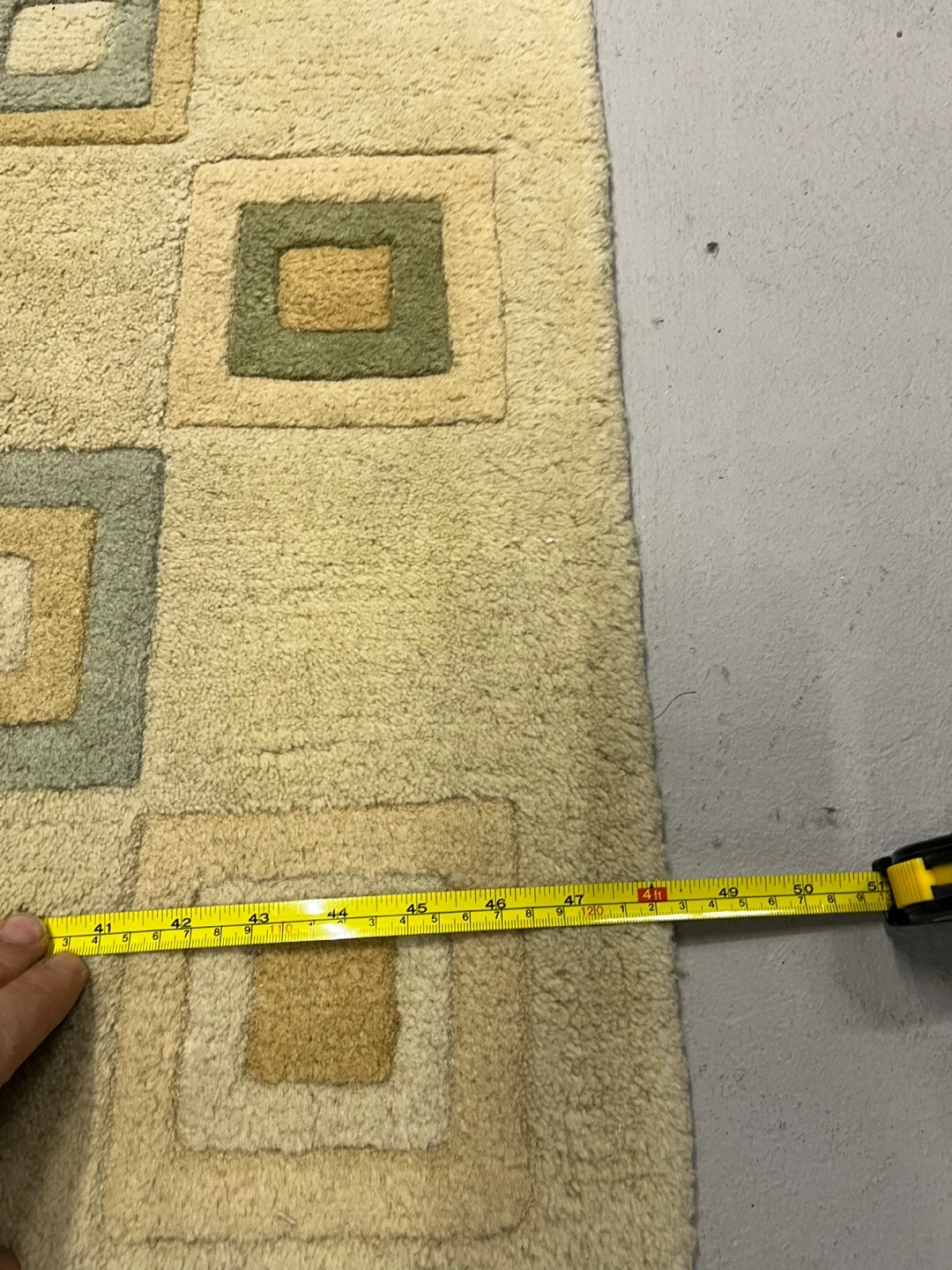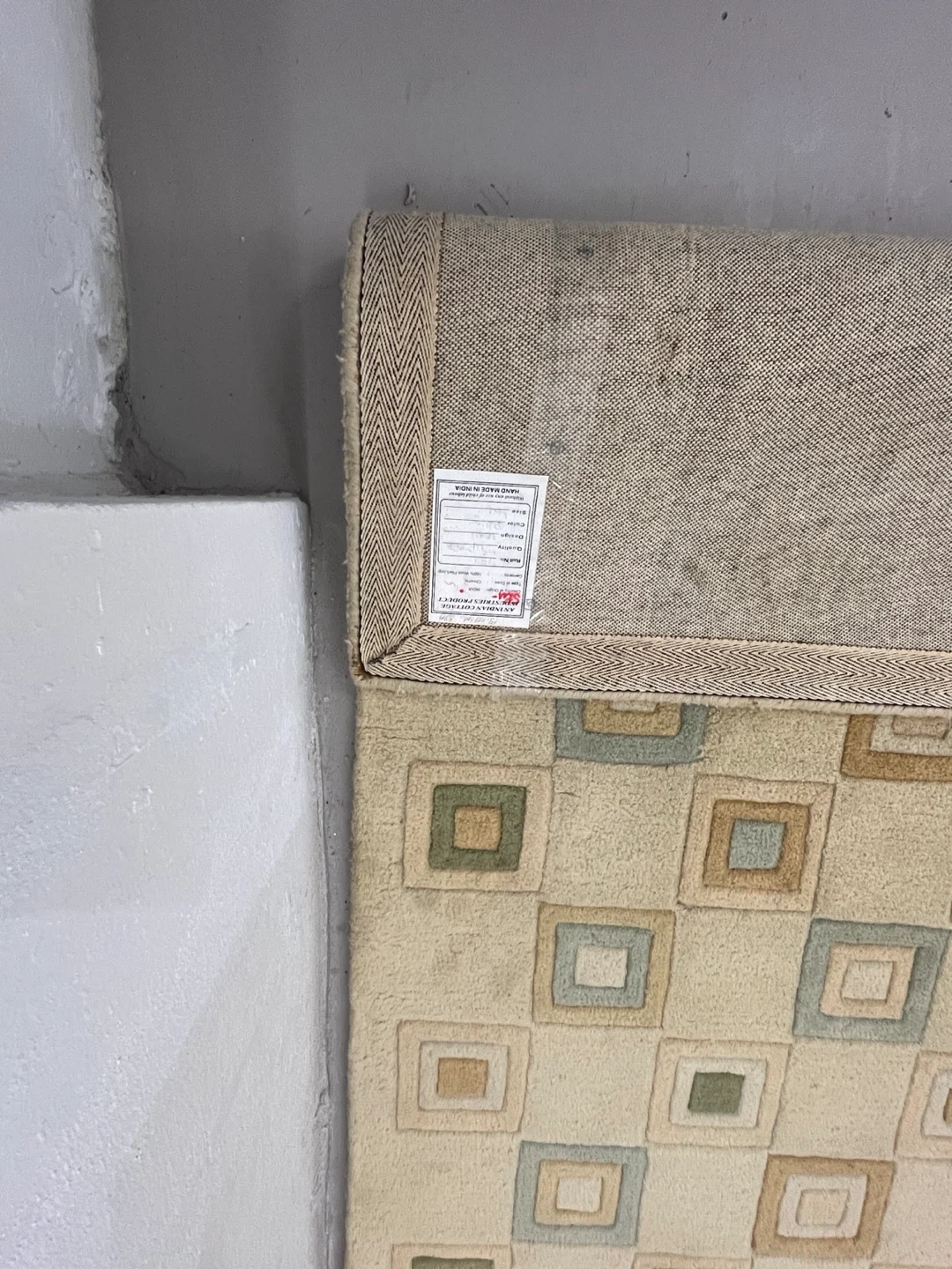 This rug is from Indian Cottage Industries and is made of 100% wool pile/loop. It's a beige colour and is in used condition.4ft 6ft
