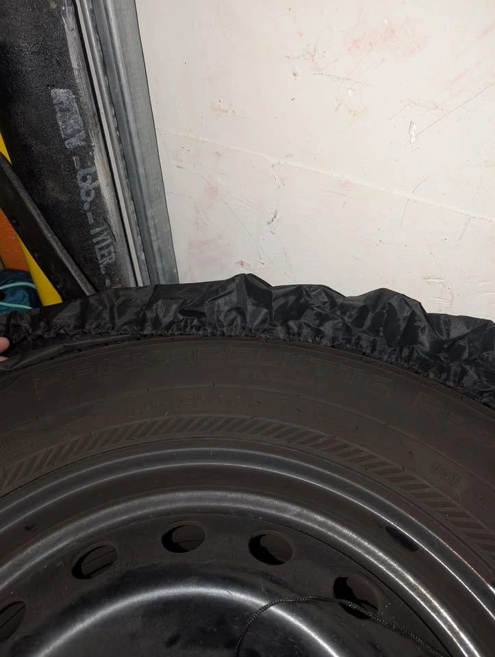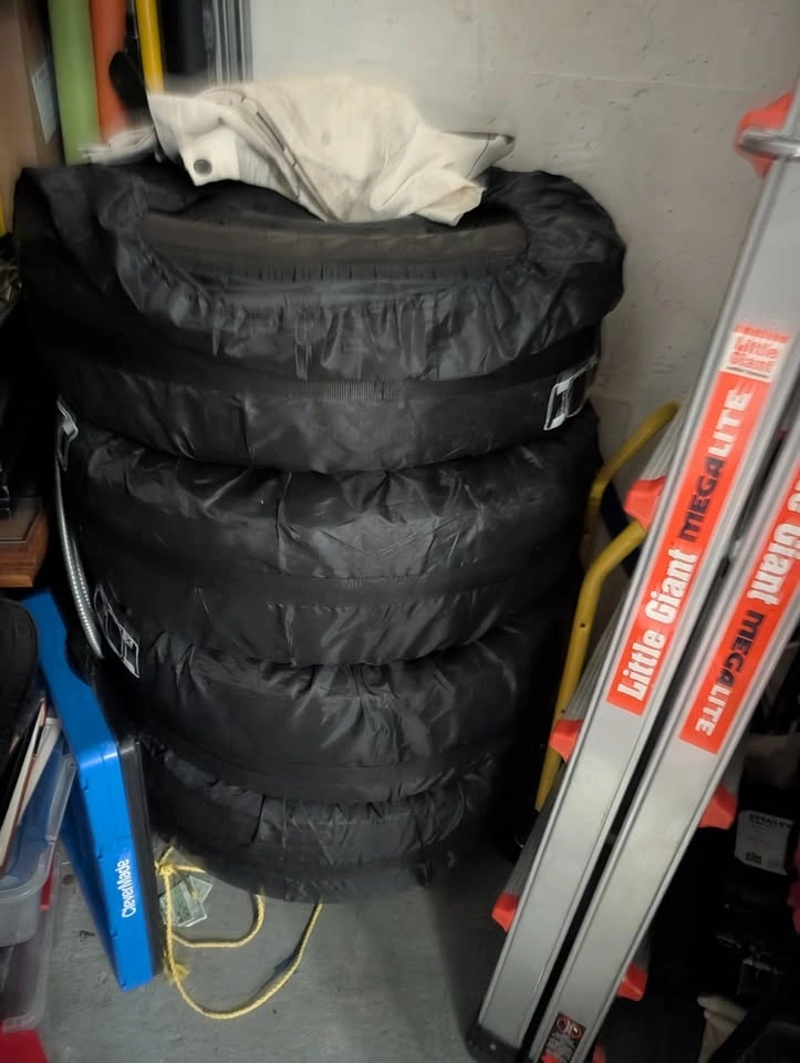 The tires have been stored in protective tire totes in a climate-controlled environment to preserve the rubber compound.