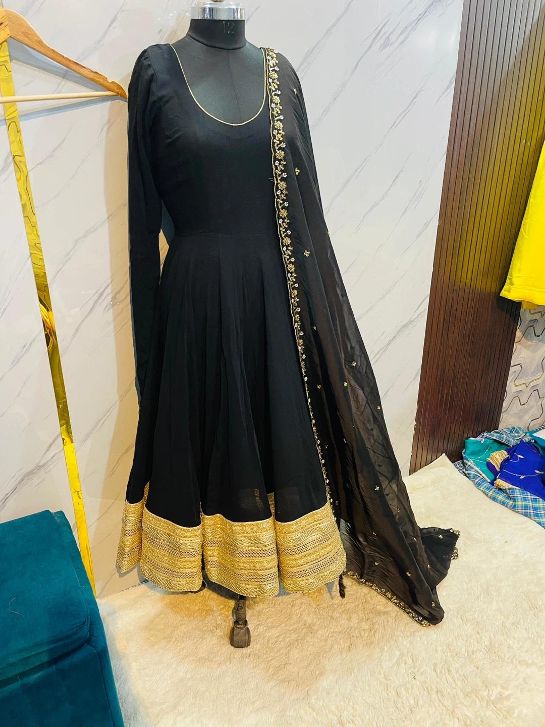 Beautiful black Anarkali dress with gold embroidery! This elegant dress features a flowing silhouette and intricate detailing. Perfect for special occasions or adding a touch of sophistication to your wardrobe