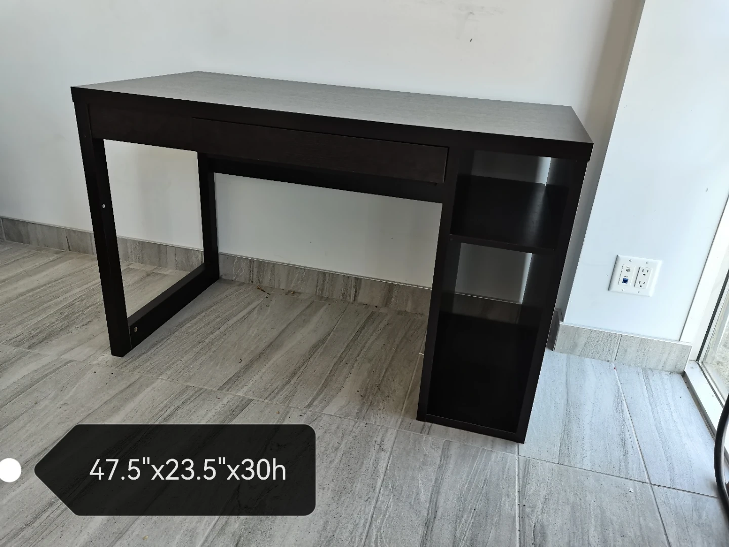 This is a used desk with a single drawer and shelving on one side, perfect for a student or home office. The dimensions are 47.5"x23.5"x30h. It's a sturdy desk and I'm looking to give it a new home.
